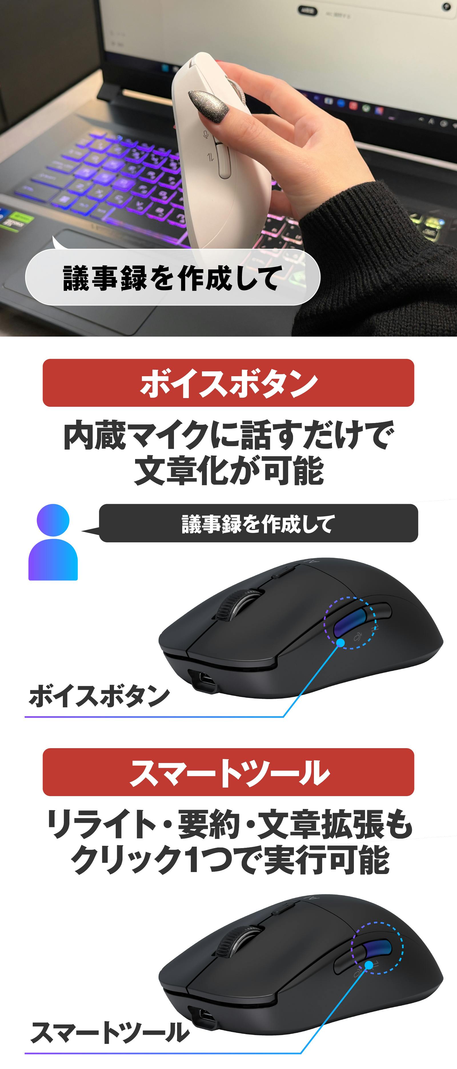 見た目は従来のマウスと変わりません。しかし内部には、高度な知能が組み込まれています。ボタンをクリックするだけで、音声入力・翻訳・要約・議事録の録音(話者識別付き)などが可能。さらにAIライティングツールや画像生成、プレゼン資料作成まで、すべてのAI機能を1つのデバイスに統合しました。