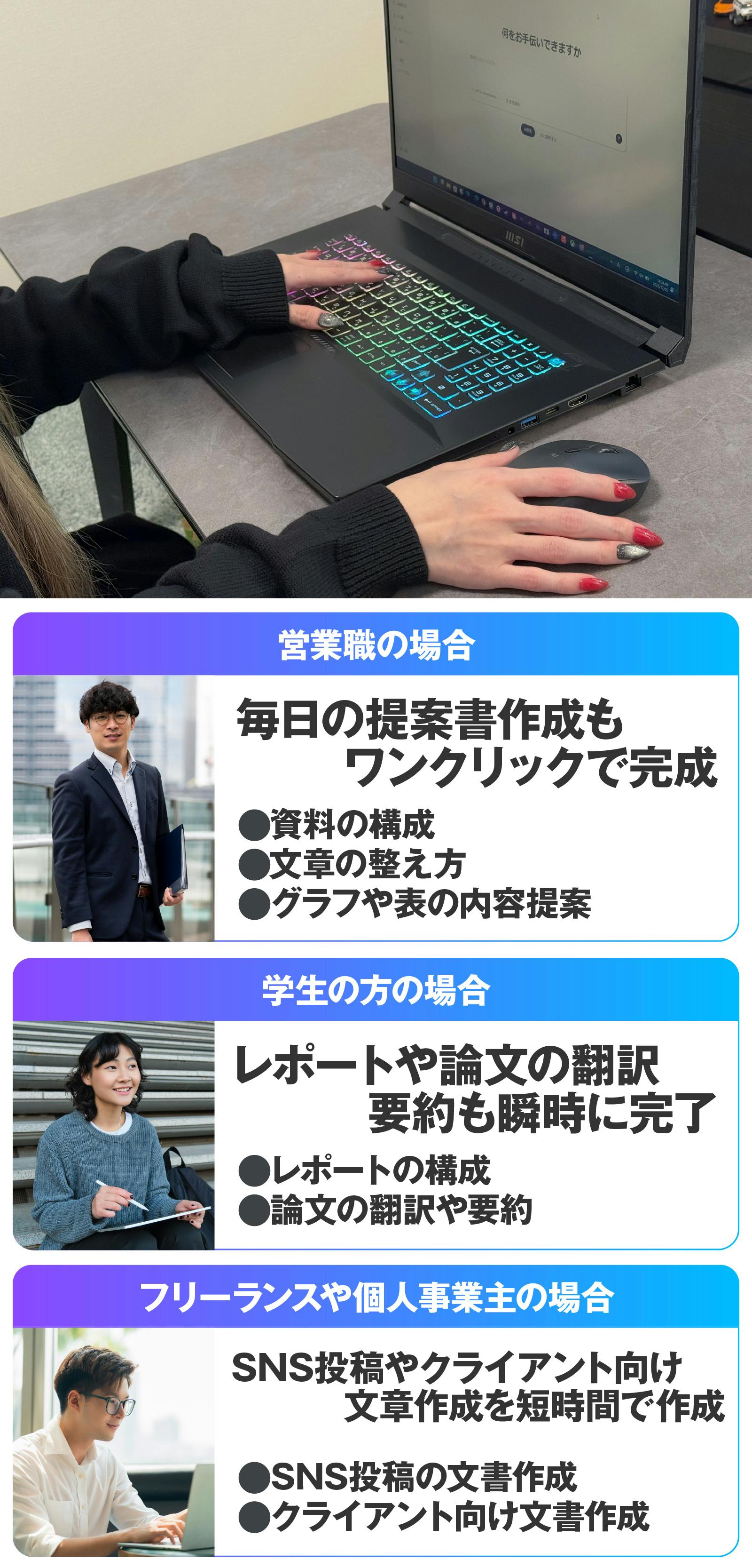 学生ならレポート作成や英語論文翻訳がスムーズに。主婦層なら、子どもの宿題や家庭文書の整理もサクサク完了。フリーランスならクライアント向け提案書も即座に仕上げられます。