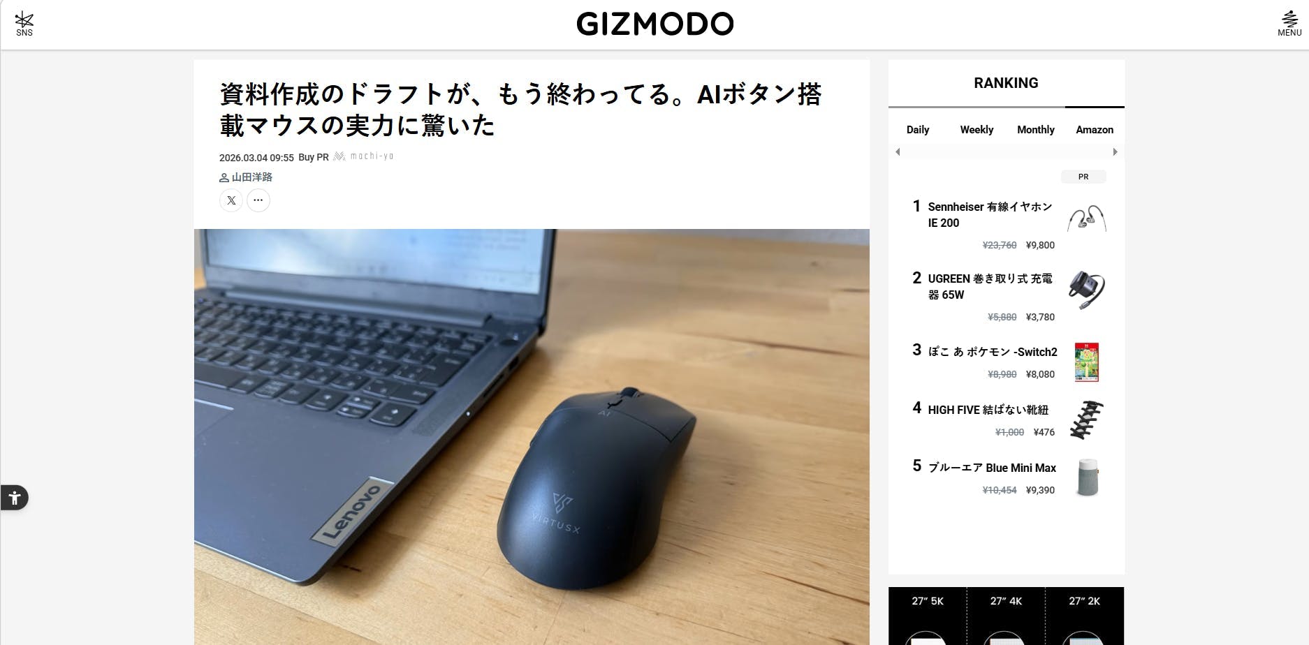 この度、人気テックメディア GIZMODO(ギズモード) にてVirtusx Jethro V1 AIマウスのレビュー記事が公開されました。