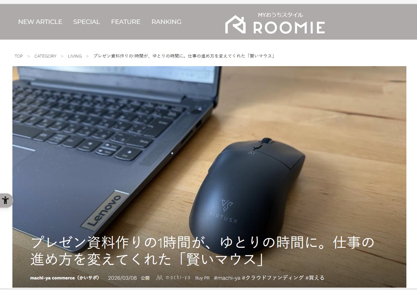 この度、ライフスタイルメディア ROOMIE(ルーミー) にてVirtusx Jethro V1 AIマウスのレビュー記事が公開されました。