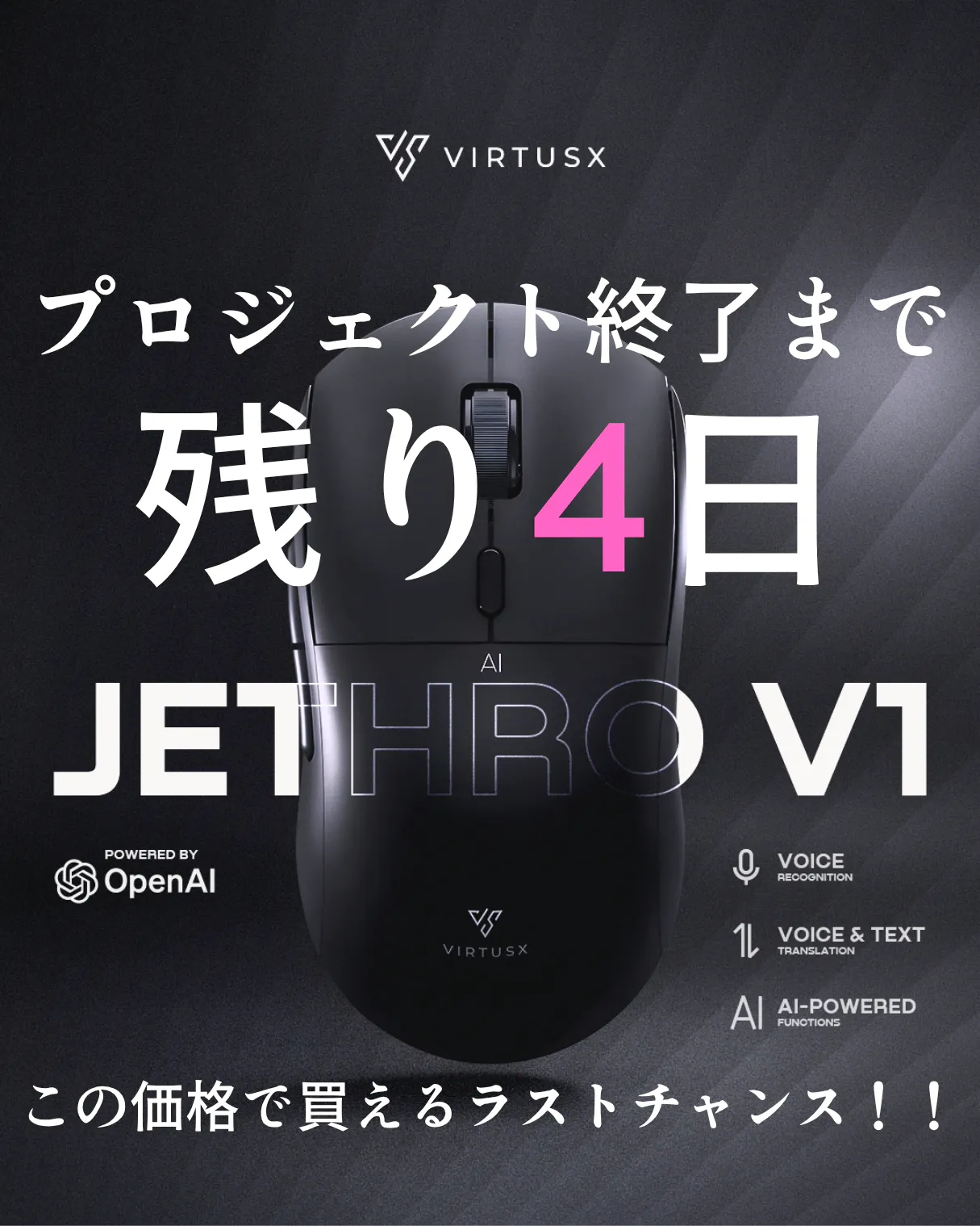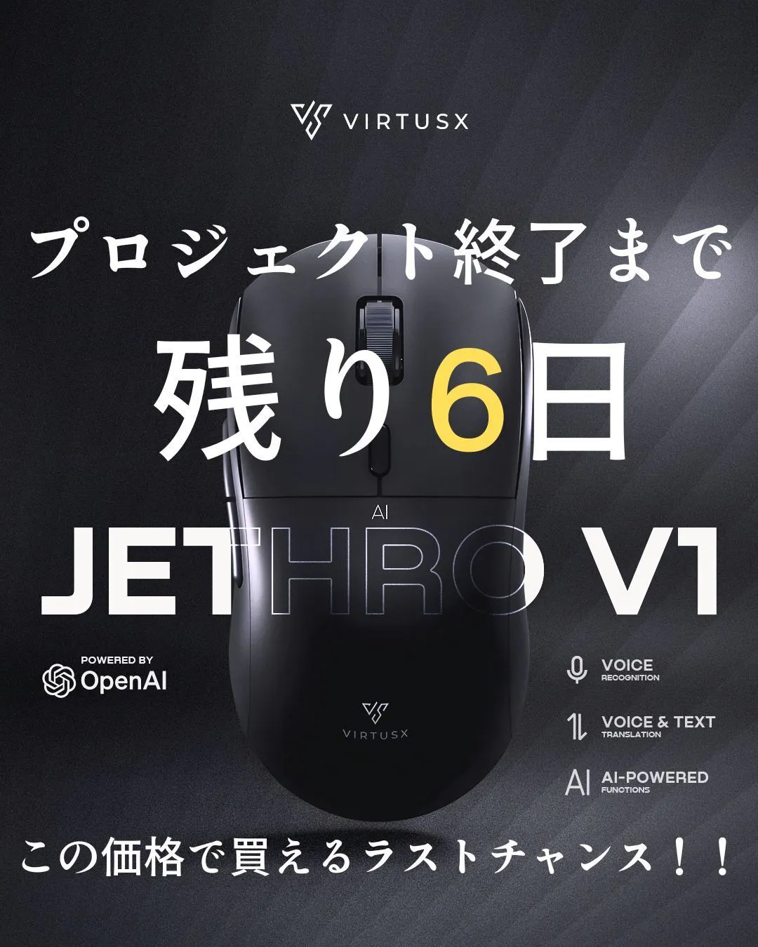 ご支援いただいた皆さま、そしてお気に入り登録をしていただいている皆さま、本当にありがとうございます。現在、「Virtusx Jethro V1 AIマウス」は多くの方にご注目いただいており、お気に入り登録も日々増え続けています。すでに「気になっている」「検討している」という方が非常に多い状況です。本プロジェクトは3月29日(日)23:59をもって終了いたします。終了後は、現在の価格や条件でのご提供はできなくなります。このAIマウスは、話すだけで文章作成・翻訳・資料作成までを自動で行い、日々の作業時間を大幅に削減します。AIに不慣れな方でもすぐに使いこなせる設計で、これまで作業にかかっていた時間を、自分のための時間へと変えることができます。「気になっていた」「後で検討しよう」と思っていた方にとって、今回が最後のチャンスとなります。プロジェクトページはこちらhttps://camp-fire.jp/projects/898361/preview?token=38z2fa8q&utm_campaign=cp_po_share_c_msg_mypage_projects_show終了まで残りわずかとなりましたが、最後まで情報発信を続けてまいります。引き続き、応援・ご支援のほどよろしくお願いいたします。HAPWYプロジェクトチーム一同