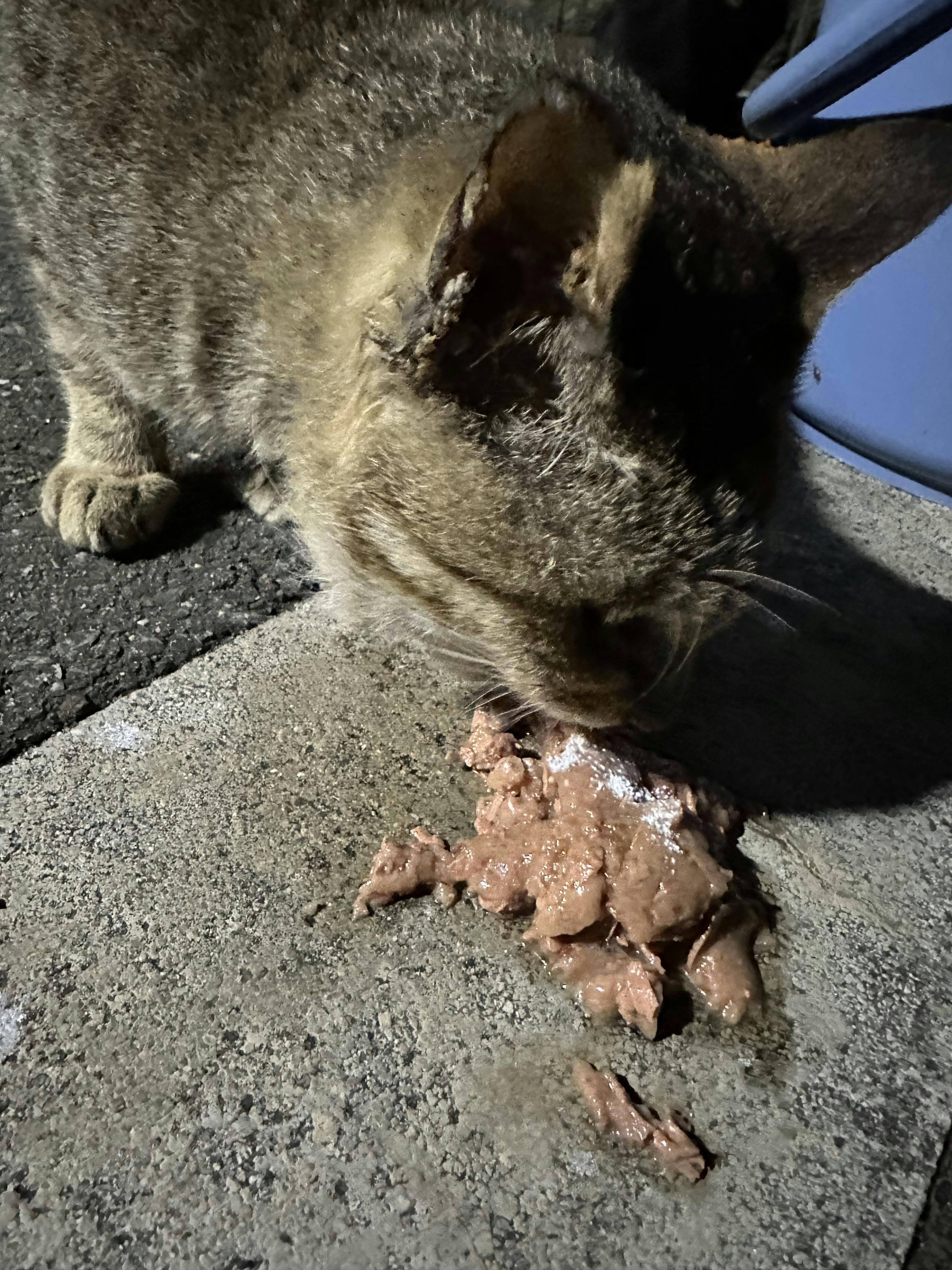 今日のガリガリのガリちゃん、ご飯時に他の子達から少し離してカルカンのパウチに抗生剤を混ぜて飲ませました風邪もひいてるし連れて帰りたい( ; ; )お皿が足りず地べたであげてしまいましたが完食してくれましたおかわりもちゃんと食べましたどんどん冷えてきますにゃあ達頑張って( ; ; )