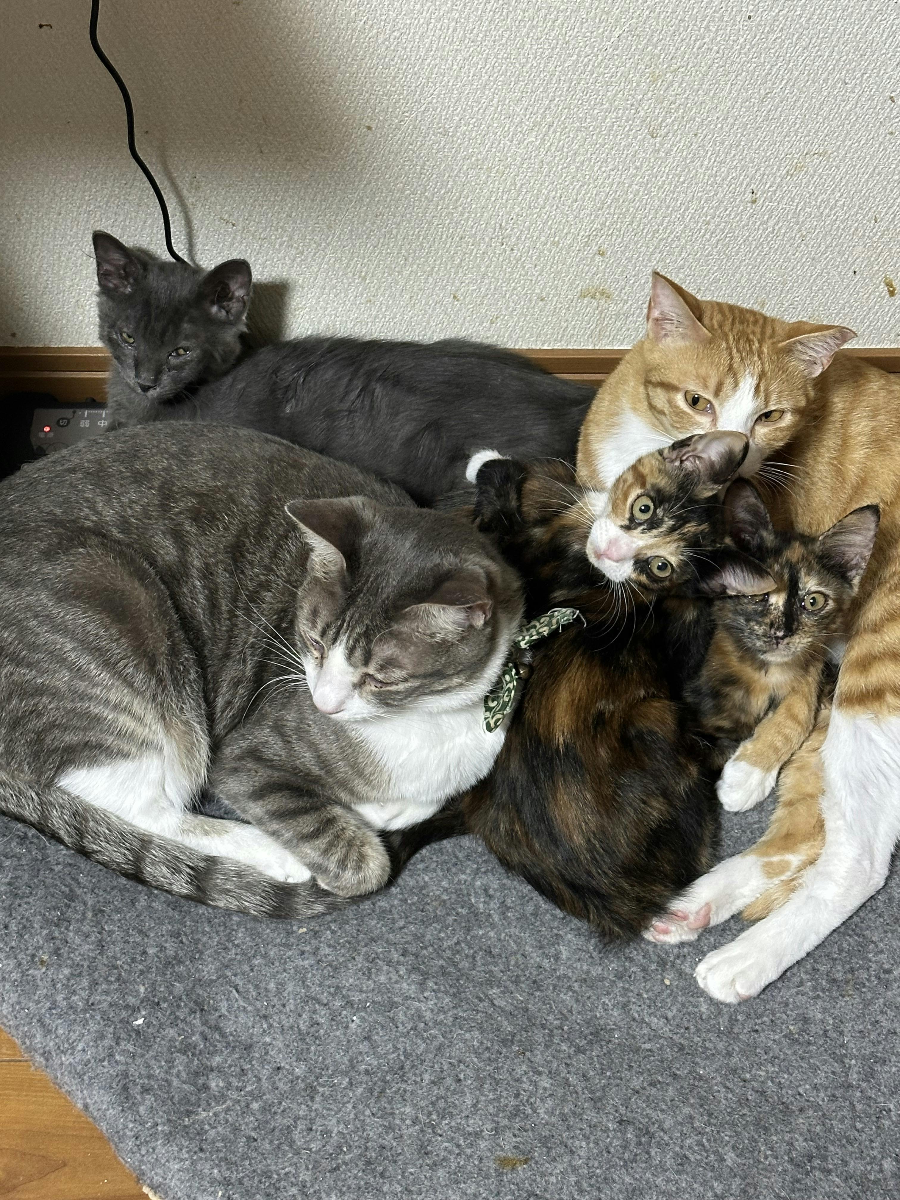 急に寒くなってきましたねぇ家で保護している子達はホットカーペットの上で猫団子になっています冬になるとお外の子達がとても心配ですみんなうちの倉庫で寒さを凌げればいいのですが頭数が頭数なだけにとても厳しいですせめてお腹いっぱいになって体温を上げて仲間達と猫団子で温めあってくれればいいのですが