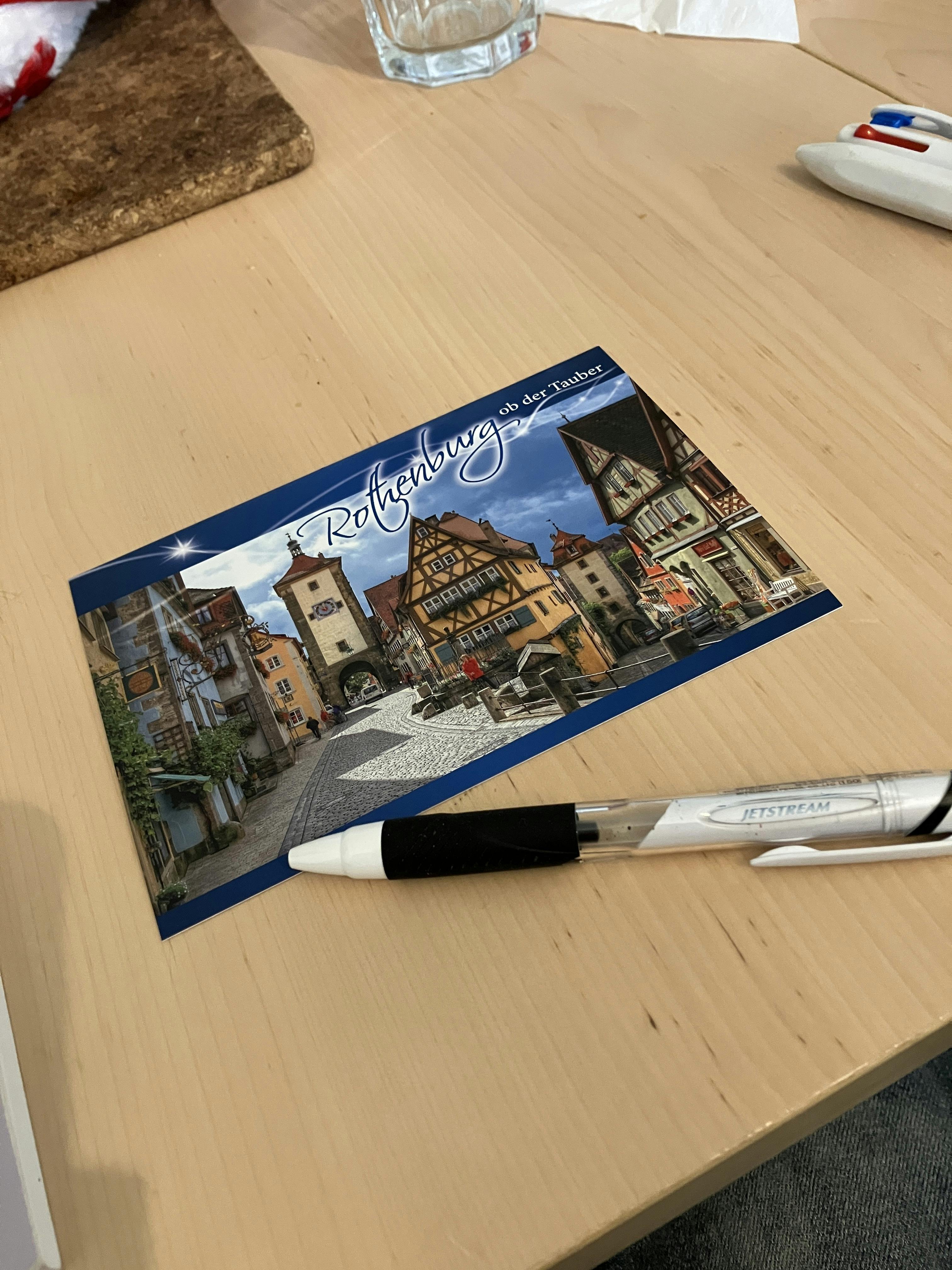 絵はがきのリターンありがとうございます。ローテンブルクドイツの絵はがきですが、フランスから、送りました。10日ほど、かかるそうです。