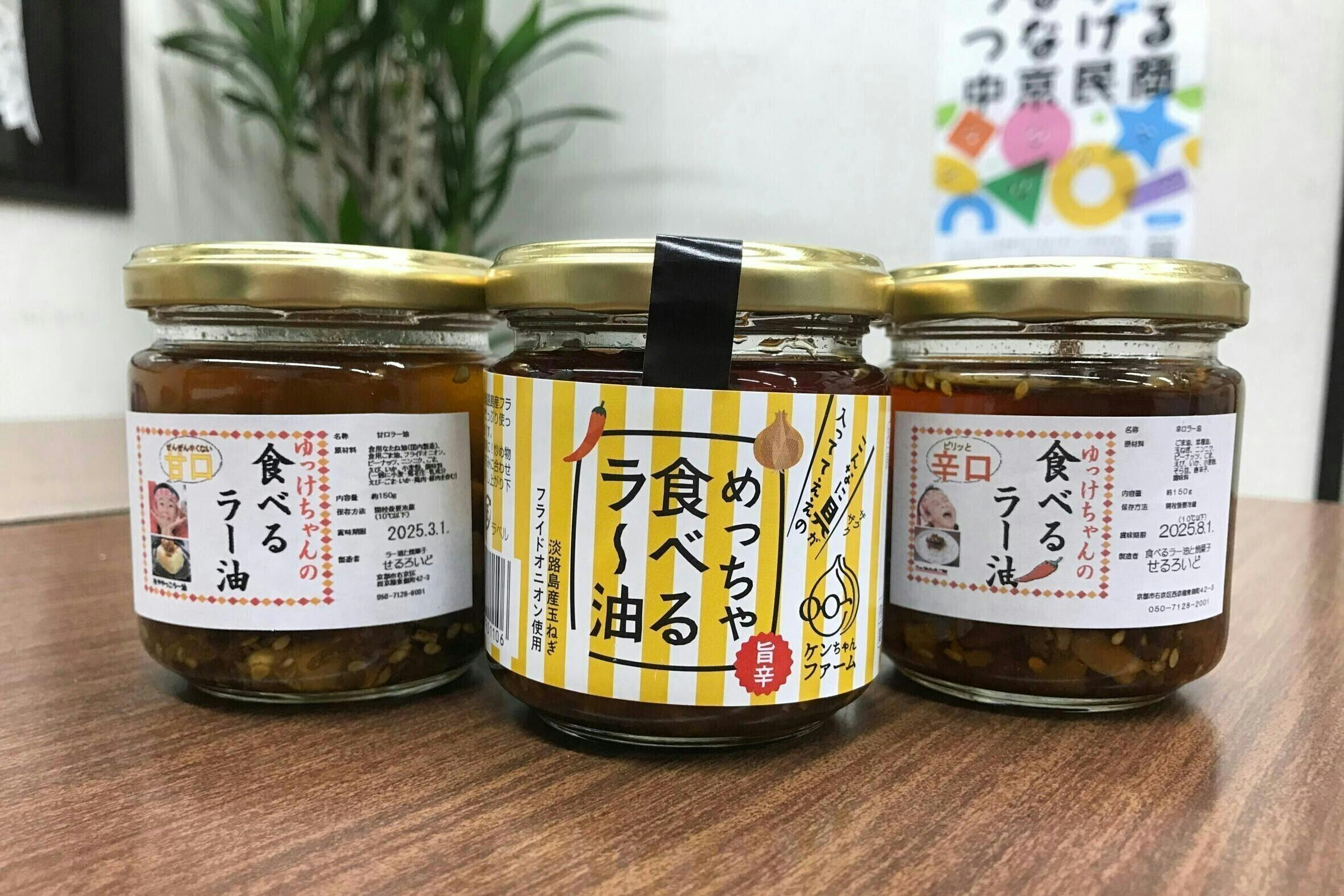※海鮮の旨味が効いたどこにもない味「食べるラー油辛口(ピリ辛)」、「食べるラー油甘口」と、淡路島玉ねぎケンちゃんファームさんとのコラボしたラー油「めっちゃ食べるラー油」を1つずつ。