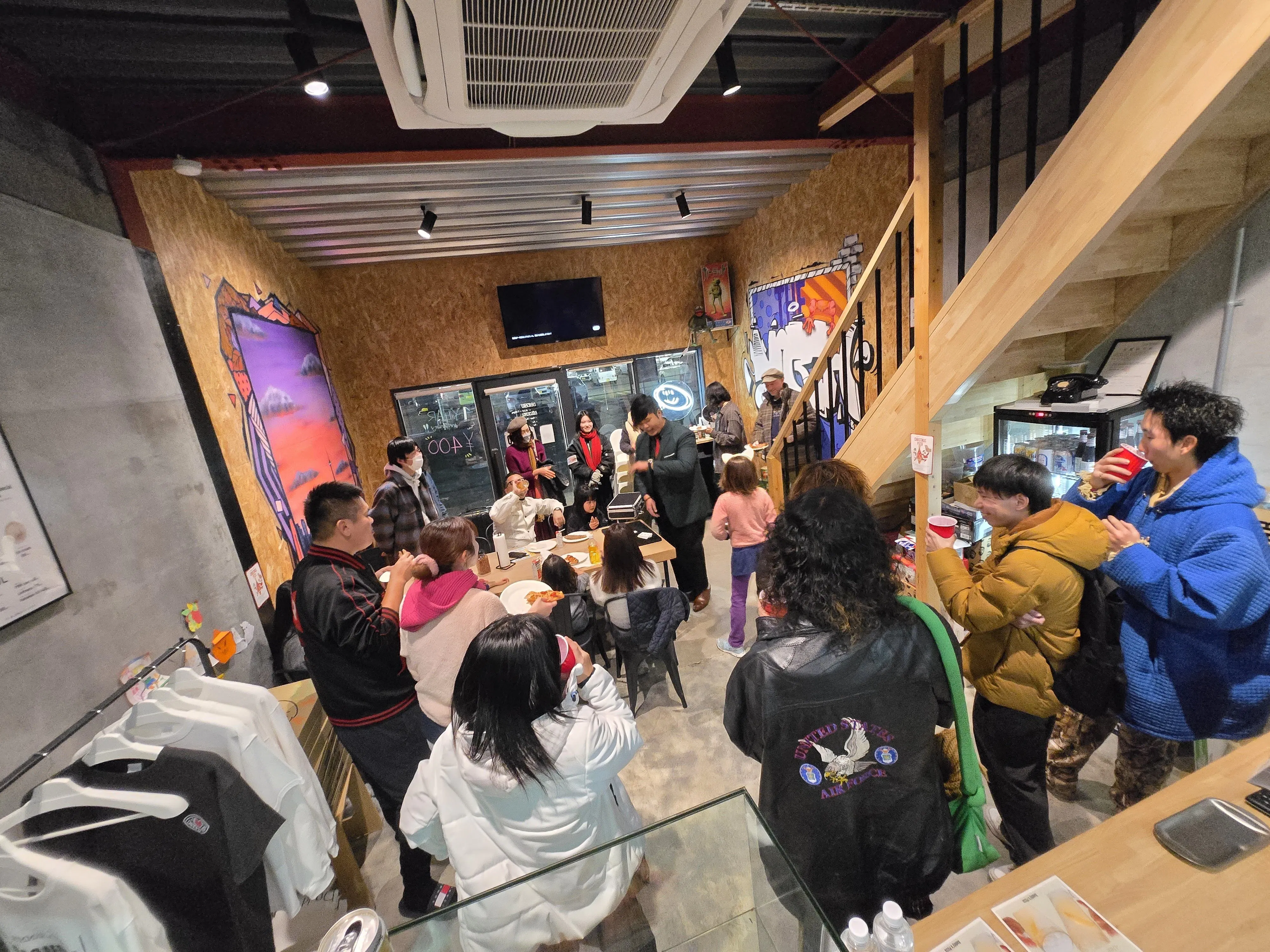 観光で訪れた人が地元の人と話し、常連さんと初めての人が同じテーブルで笑い、音楽をきっかけに会話が生まれる。