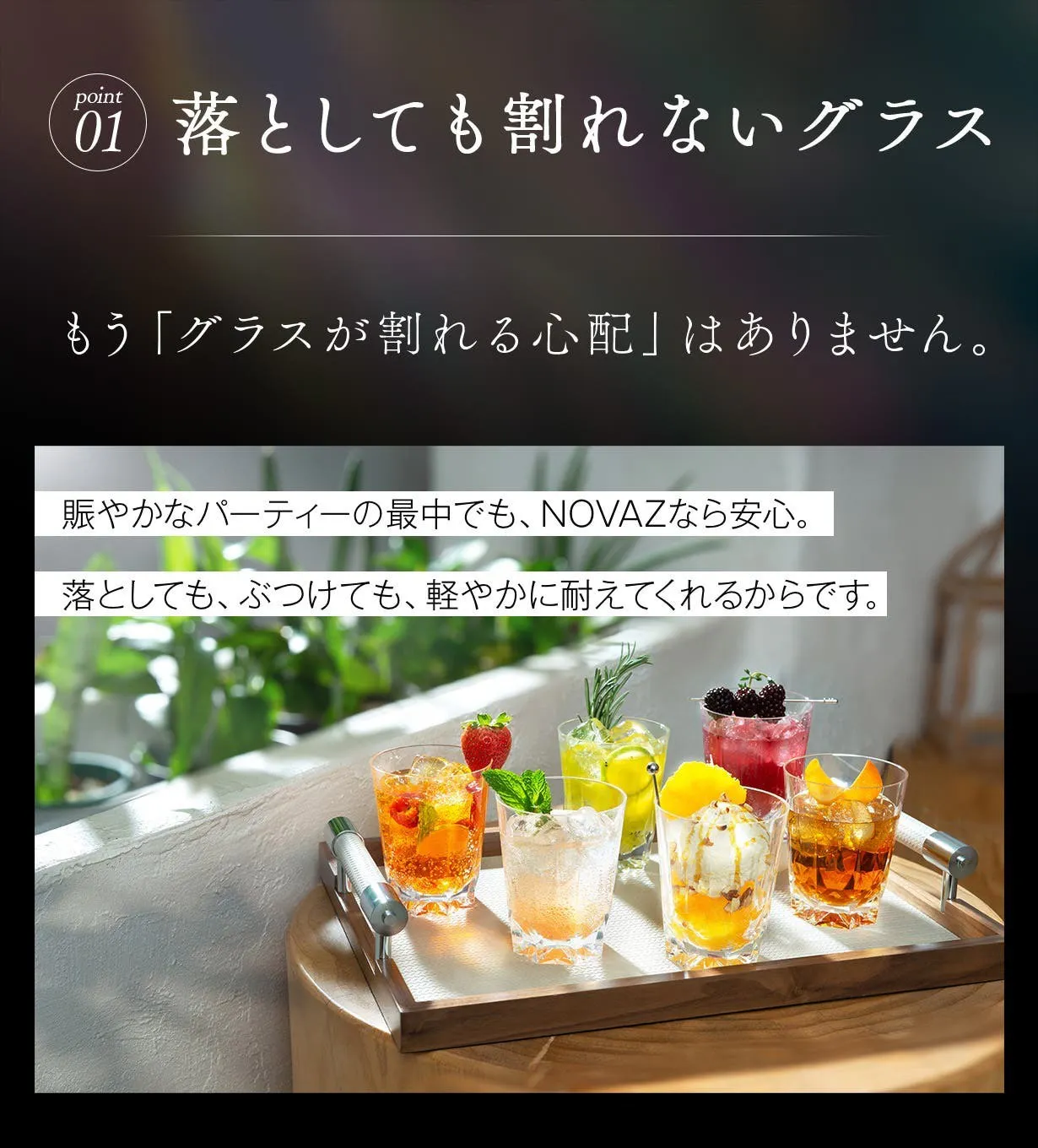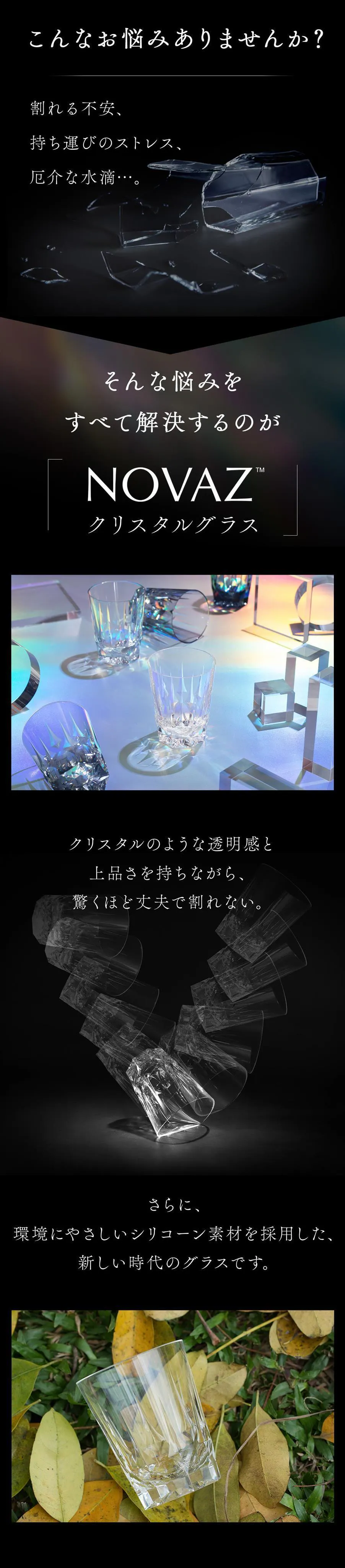 「NOVAZ クリスタルグラス」は、クリスタルのような透明感と上品さを保ちながら、割れない安心感と環境にやさしい素材を兼ね備えた新しい乾杯グラスです。