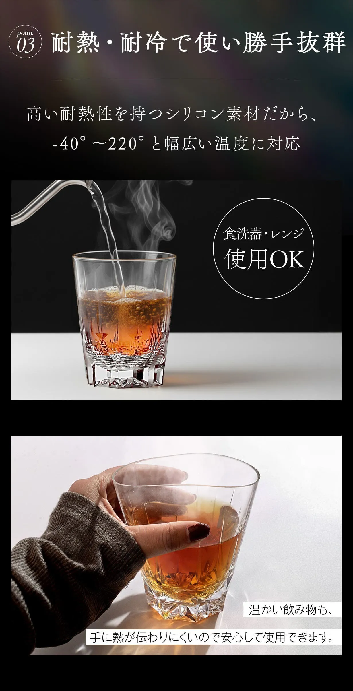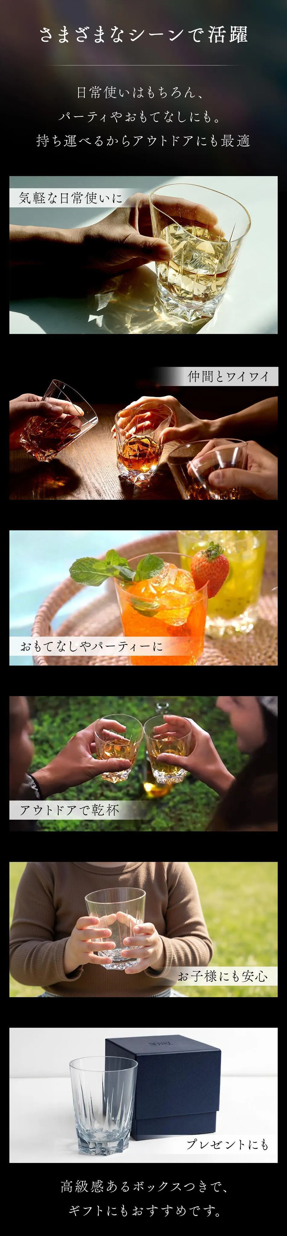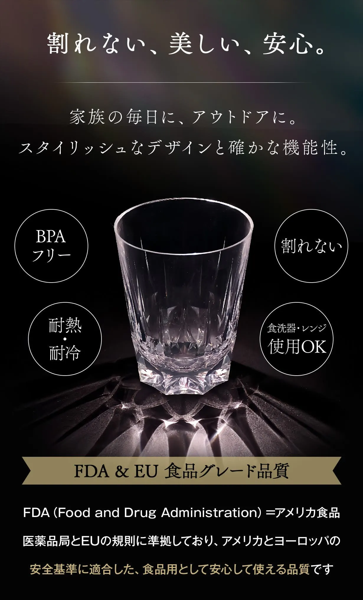A. クリスタルのように見える割れないグラスです!壊れやすさを気にせずにクリスタルの美しさと透明感に包まれる瞬間を想像してみてください。