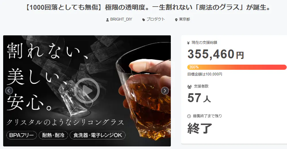 2026/03/16 17:41サポーター様、【1000回落としても無傷】極限の透明度。一生割れない「魔法のグラス」が誕生。にご興味をお持ちいただきありがとうございます。プロジェクト開始から44日目で57人ものご支援者の方々より支援頂き、無事プロジェクト終了を迎えることが出来ました。早速皆様のリターンを2026年06月末にお届けできるよう準備を始めております!皆様にご満足いただけるリターンをお届けできるよう、全力で取り組んで参りますので引き続き、「【1000回落としても無傷】極限の透明度。一生割れない「魔法のグラス」が誕生。」をよろしくお願い致します。BRIGHTチーム もっと見る