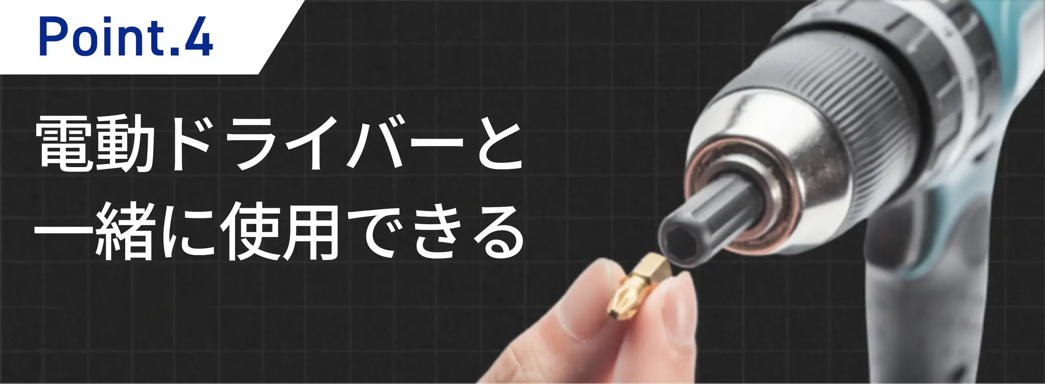 手動では不十分な場合、標準の1/4インチ六角ビットホルダーを外し、電動ドライバーでインパクトなしで使用できます。追加の力が必要な際は、ツールに任せましょう。