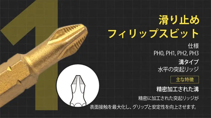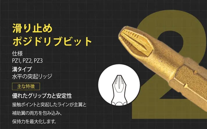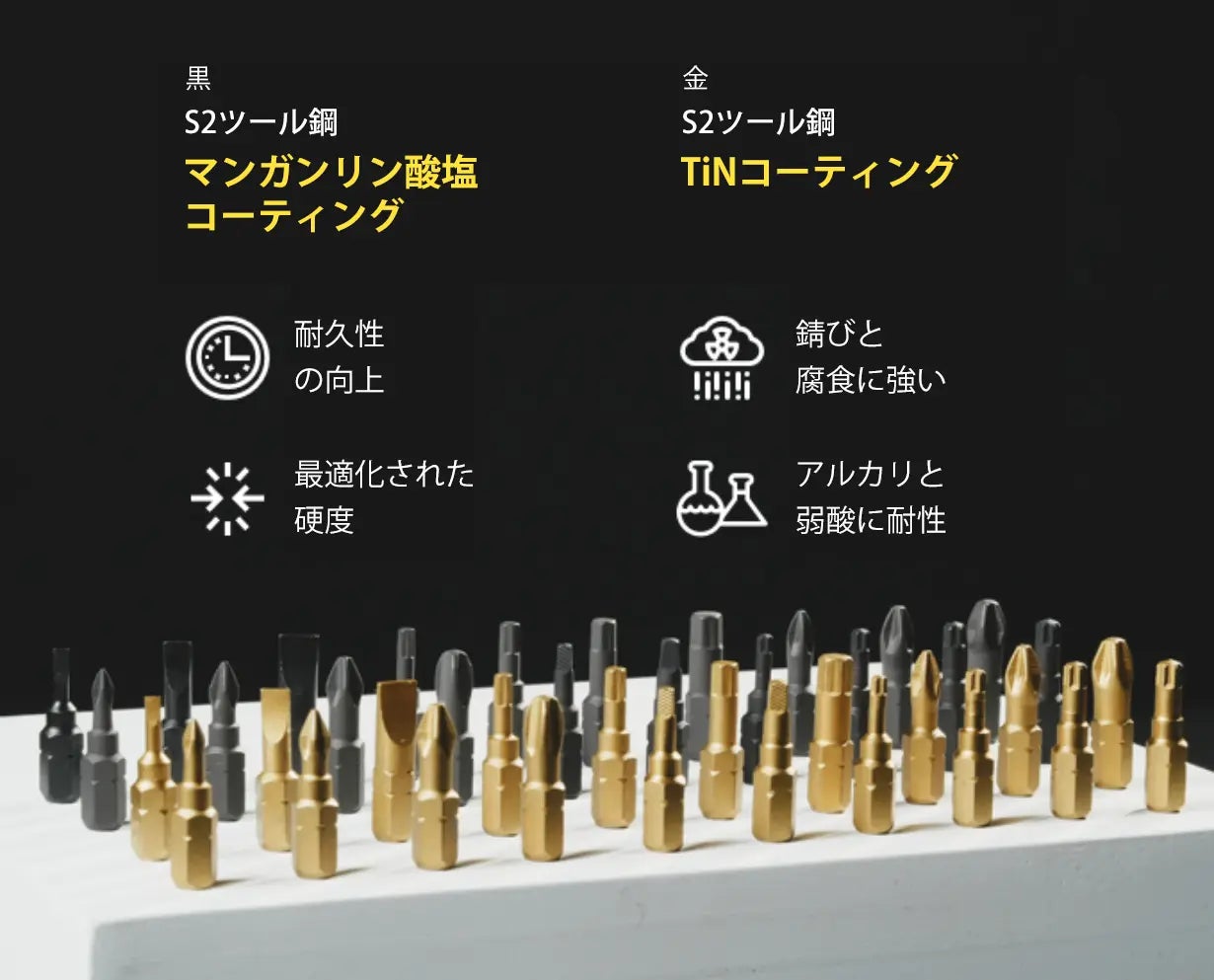 Spinner Drive Proは、標準のクロムバナジウムビットと比較して優れた耐摩耗性と硬度を持つS2ツールスチールビットを採用しています。黒いビットはマンガンリン酸塩コーティングを施しており、摩耗と酸化に対する追加の保護を提供し、金色のビットはチタンナイトライド(TiN)でコーティングされており、耐久性と耐腐食性が向上しています。これにより、どんな作業でも長持ちする性能が保証されます。