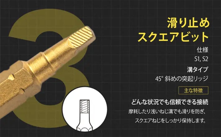 Spinner Drive ProはS2ツール鋼製で、精密鍛造されたアンチスリップビットがグリップを強化し、回転時の安定性とコントロールを提供します。