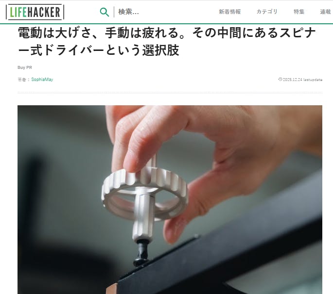2025/12/29 21:00皆様、こんばんは!Brightチームです。12月24日、Lifehackerで「Spinner Drive Pro」を紹介して頂きました。話題:電動は大げさ、手動は疲れる。その中間にあるスピナー式ドライバーという選択肢興味がある方、是非下記のリンクからアクセスしてみてください。https://www.lifehacker.jp/article/machi-ya-spinnerdrivepro-start-898496/【レビューの一部抜粋】〈回転力でネジ締めがラクになる「Spinner Drive Pro」のユニークなポイントが大きな車輪。名前のとおり回転をサポートするパーツであり、勢い良く回せるので少ない力でも効率的にネジ締めができますよ。正確な仕組みは車輪より本体の精密ボールベアリングによるもの。お尻側を押さえておけば、先端部分はスムーズに回転。また上記の動画のとおりスピナーホイールは取り外せるので、狭い場所や精密な作業が必要な場所でもしっかり使えます。ビットは定番の磁石式で交換もスムーズ。〉ご興味のある方はこの機会をお見逃しなく!https://camp-fire.jp/projects/898496/view1月31日まで販売期間は続きますので、ぜひSNSでのシェアや身近な方にもおすすめしていただけると嬉しく思います。#spinnerdrivepro #brightdiyどうぞよろしくお願い致します。BRIGHTチーム もっと見る