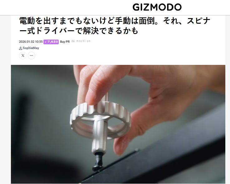 2026/01/07 21:00皆様、こんばんは!Brightチームです。1月2日、Gizmodoで「Spinner Drive Pro」を紹介して頂きました。話題:電動を出すまでもないけど手動は面倒。それ、スピナー式ドライバーで解決できるかも興味がある方、是非下記のリンクからアクセスしてみてください。https://www.gizmodo.jp/2026/01/machi-ya-spinnerdrivepro-start-898496.html【レビューの一部抜粋】〈滑り止めビットでネジをナメさせない「Spinner Drive Pro」は滑り止めビットを採用しているのも魅力的なポイント。ネジがナメる原因であるビットとネジ穴の接触面積不足を解決してくれます。動画の実験のように高い摩擦力を維持するので、一般的なビットよりネジ山を潰すリスクが大きく減らせるでしょう。〉ご興味のある方はこの機会をお見逃しなく!https://camp-fire.jp/projects/898496/view1月31日まで販売期間は続きますので、ぜひSNSでのシェアや身近な方にもおすすめしていただけると嬉しく思います。#spinnerdrivepro #brightdiyどうぞよろしくお願い致します。BRIGHTチーム もっと見る