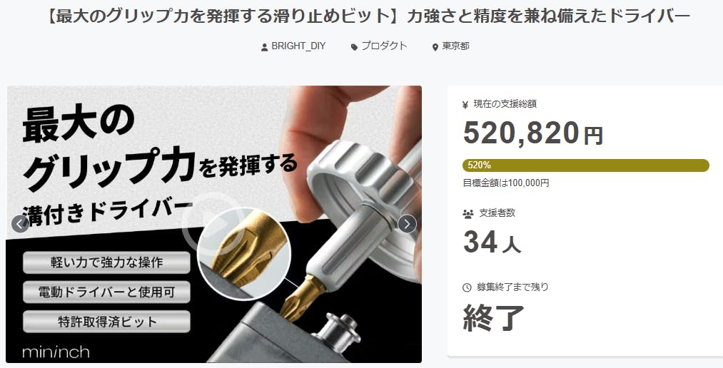 2026/02/01 11:24ご支援者様、【最大のグリップ力を発揮する滑り止めビット】力強さと精度を兼ね備えたドライバーにご興味をお持ちいただきありがとうございます。プロジェクト開始から38日目で34人ものご支援者の方々より支援頂き、無事プロジェクト終了を迎えることが出来ました。早速皆様のリターンを2026年02月末にお届けできるよう準備を始めております!皆様にご満足いただけるリターンをお届けできるよう、全力で取り組んで参りますので引き続き、「【最大のグリップ力を発揮する滑り止めビット】力強さと精度を兼ね備えたドライバー」をよろしくお願い致します。BRIGHTチーム もっと見る