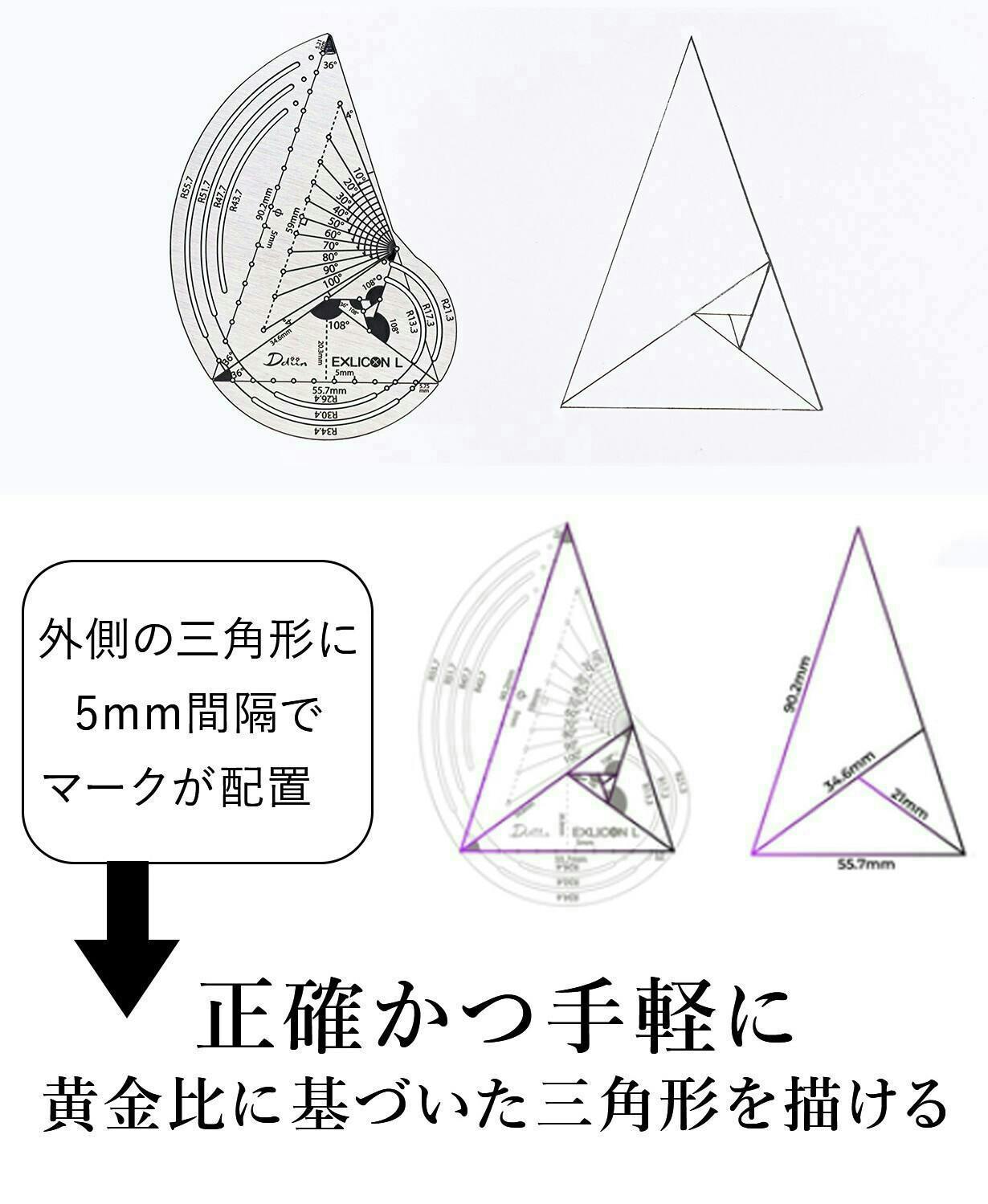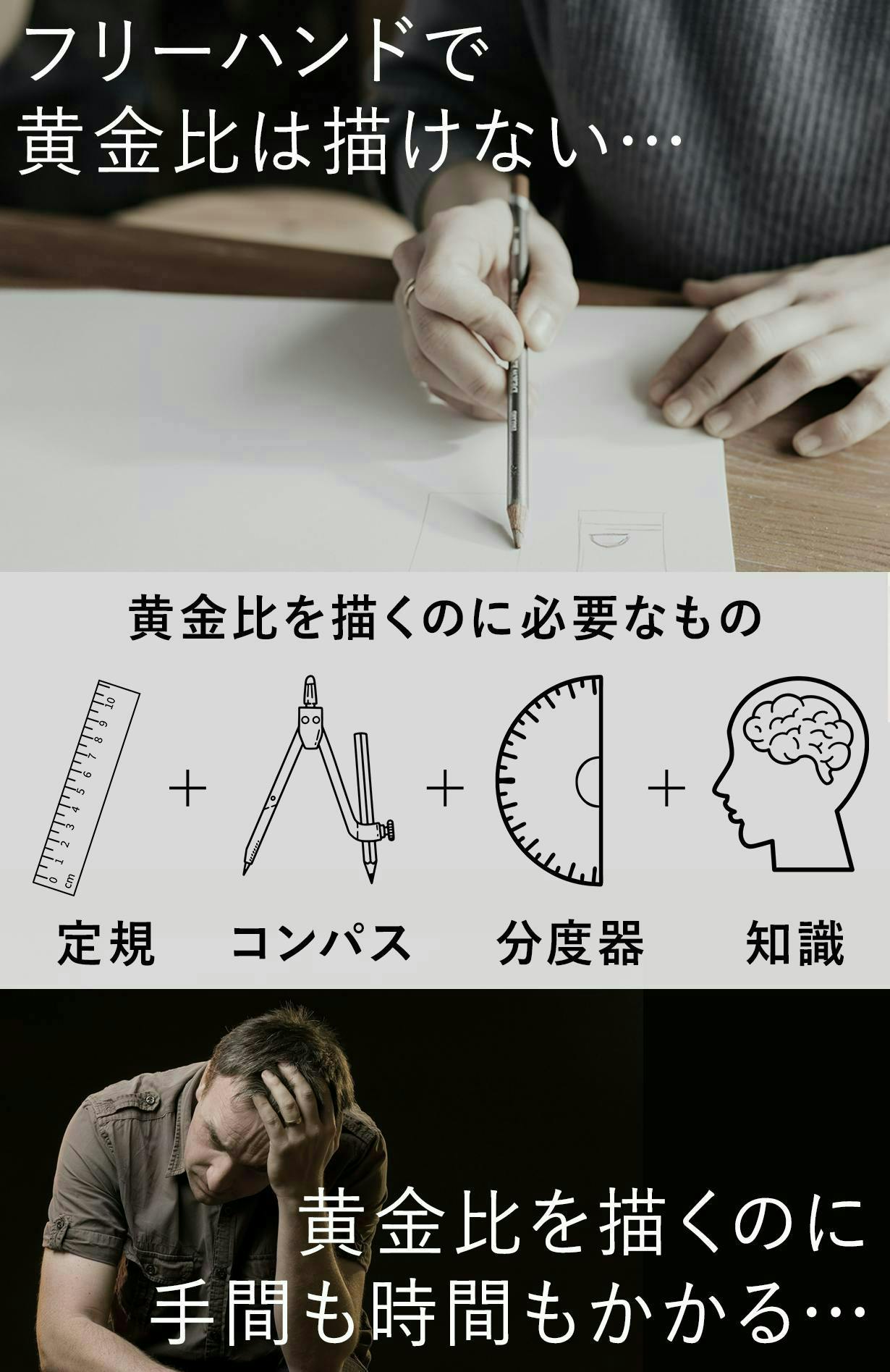 黄金比という名前は知っていましたが、自分で描くのは本当に難しい上に、計算や測定が面倒で、もっと簡単に正確に描けたらいいのに…とずっと感じていました。