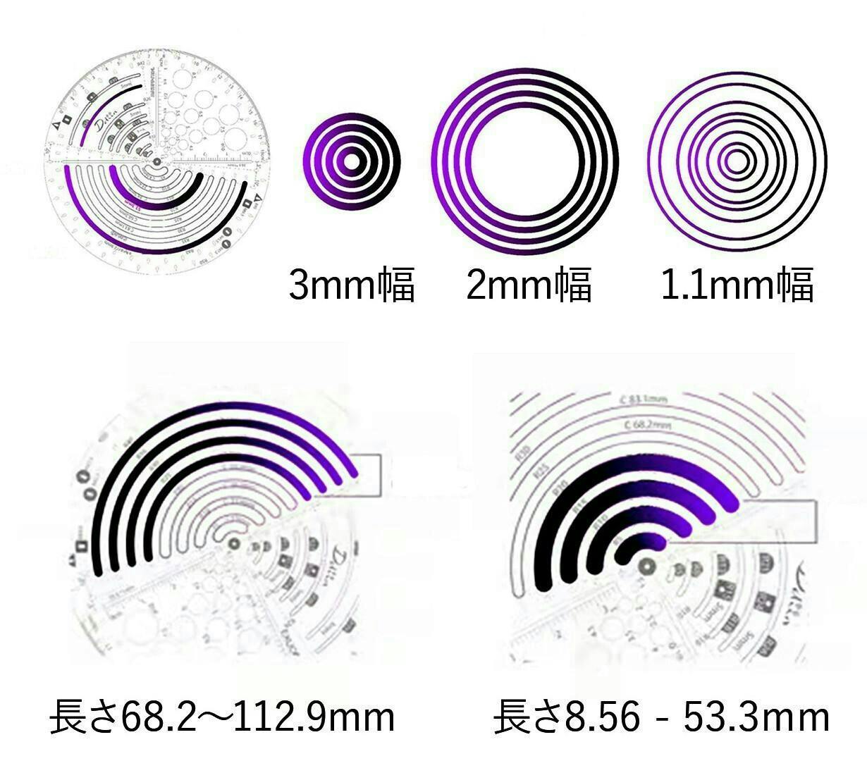 A:円ツールの場合、描画できる円の最大サイズは半径 95 mm、作成できる最小サイズは半径 0.5 mm 、三角形ツールの場合、描画できる円の最大サイズは半径 90 mm、作成できる最小サイズは半径 7.2 mm 、TGツールの場合、描画できる円の最大サイズは半径 94 mm、作成できる最小サイズは半径 5 mm です。