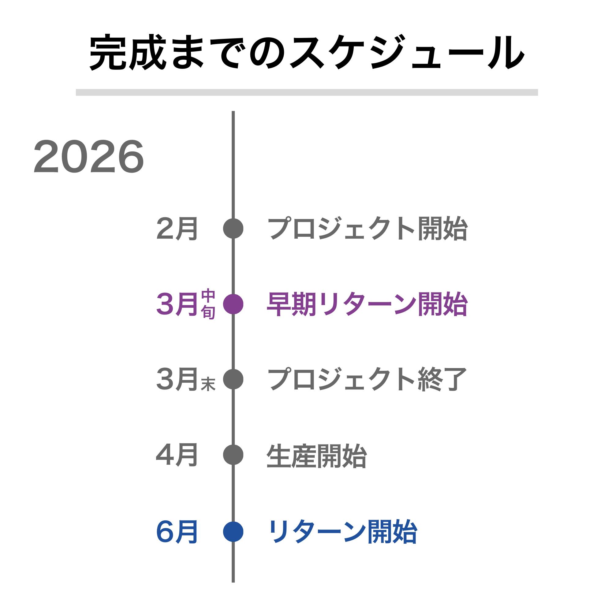 ※本文中に記載させていただいたスケジュールは、あくまでプロジェクト公開時点の予定です。クラウドファンディングを経て輸入を行う性質上、配送遅延のおそれがございます。