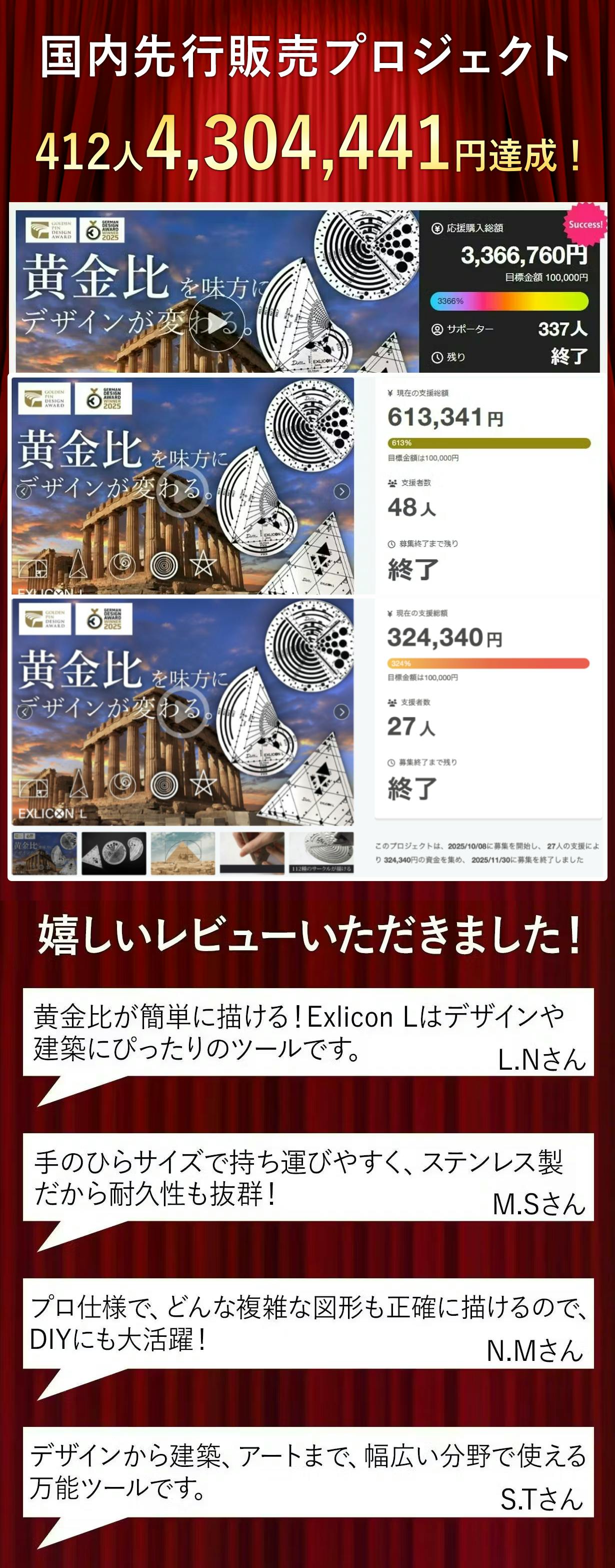 誰でも簡単に黄金比を描けて、それをデザインに活かすことができます。それだけでなく、さまざまな形状やアイデアの実現にも役立つこの Exlicon L は、デザインや設計に悩む人の力強い味方になってくれると信じ、自信をもって紹介します!