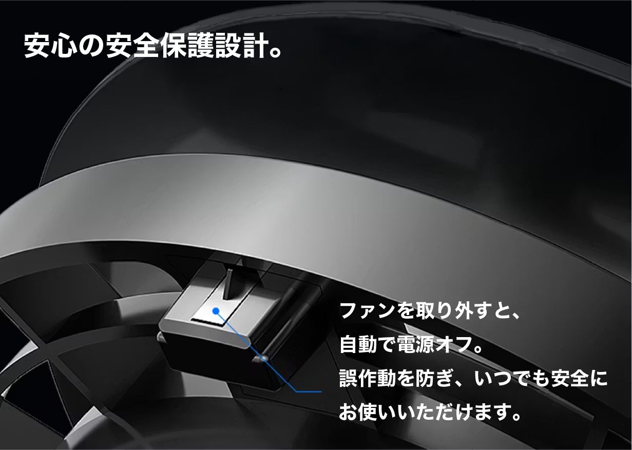 さらに、安全性にも配慮されています。本体からファンホストを取り外すと、内蔵された金属ピンが自動で作動し、バッテリーへの電流を遮断します。これにより、誤作動やショートのリスクを防ぎ、掃除や移動の際も安心して扱えます。ファンホストをレンジフードに取り付けると金属ピンが押し戻され、回路が接続されるため、操作は簡単ながら安全性も確保されているのです。