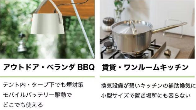 キャンプやベランダでのBBQは楽しいですが、煙やニオイの問題は避けられません。特にテント内やタープ下など密閉空間では煙がこもりやすく、周囲に迷惑をかけることもあります。そんな時、CORDLESS PORTABLE HOODはモバイルバッテリー駆動でコードレスのため、どこでも手軽に設置できます。電源がなくても煙や油分をしっかり吸引し、快適な空気環境を保てます。コンパクトで持ち運びやすく、キャンプやBBQをより楽しくしてくれます。