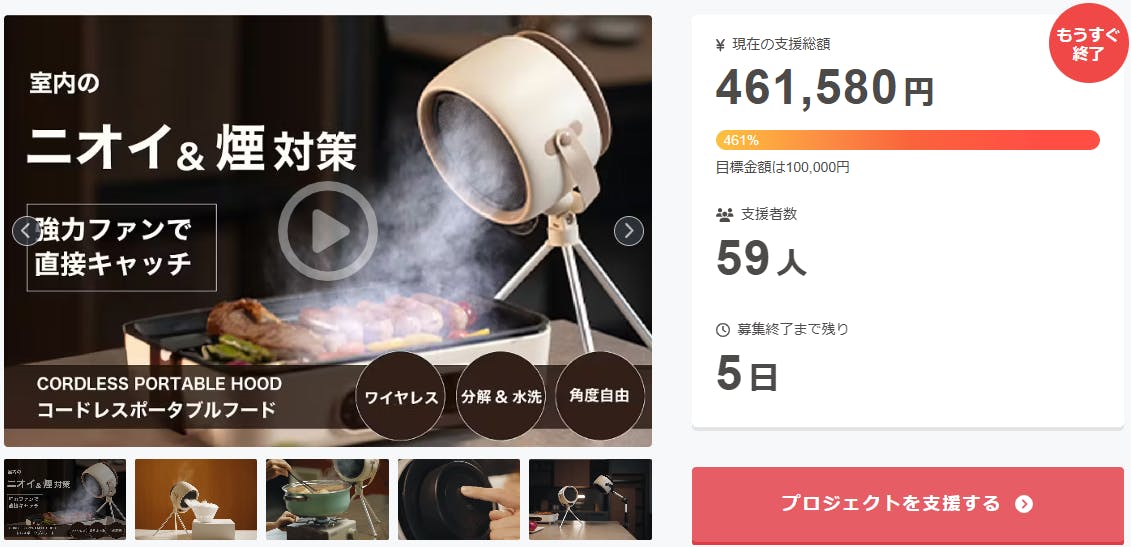 プロジェクト終了後、「煙・油・ニオイを瞬時に強力吸収する場所を選ばないコードレス換気扇」をCampfire特別価格で入手することはできなくなりますので、ご支援がまだの方、追加支援をご検討の方はお急ぎくださいますようお願い申し上げます。