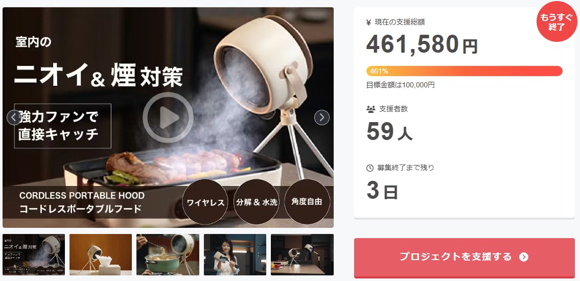 プロジェクト終了後、「煙・油・ニオイを瞬時に強力吸収する場所を選ばないコードレス換気扇」をCampfire特別価格で入手することはできなくなりますので、ご支援がまだの方、追加支援をご検討の方はお急ぎくださいますようお願い申し上げます。