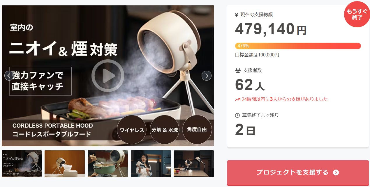 プロジェクト終了後、「煙・油・ニオイを瞬時に強力吸収する場所を選ばないコードレス換気扇」をCampfire特別価格で入手することはできなくなりますので、ご支援がまだの方、追加支援をご検討の方はお急ぎくださいますようお願い申し上げます。