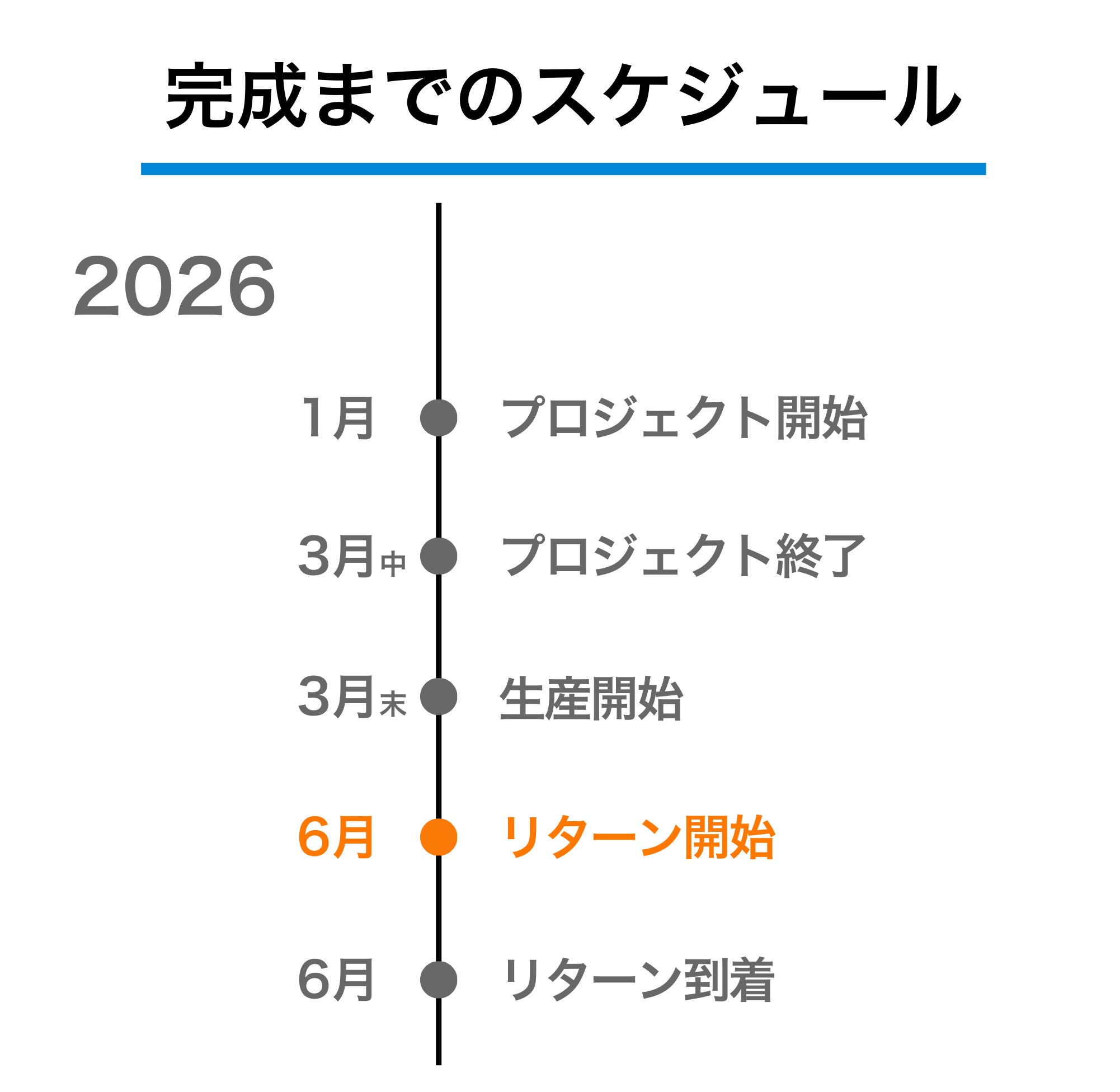 ※本文中に記載させていただいたスケジュールは、あくまでプロジェクト公開時点の予定です。クラウドファンディングを経て輸入を行う性質上、配送遅延のおそれがございます。