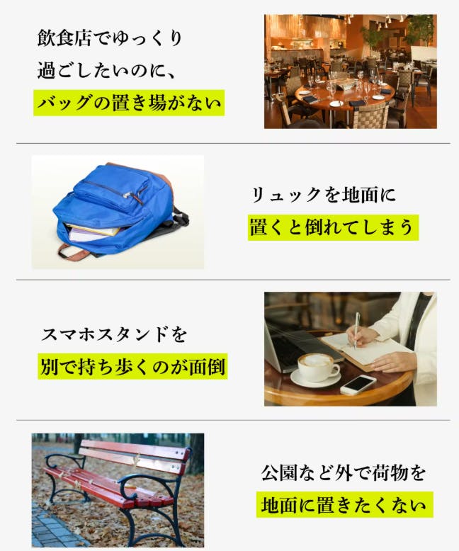外出先でバッグの置き場に困った経験はありませんか。カフェやレストラン、打ち合わせの席など、床にバッグを置くことに抵抗を感じるシーンは意外と多いものです。さらに、スマートフォンを立てて使いたい場面も増えています。そんな日常の小さな悩みを1つで解決するために生まれたのが、バッグハンガーとスマホスタンドを兼ね備えた本製品です。シンプルで無駄のないデザインは、どんなシーンにも自然になじみます。