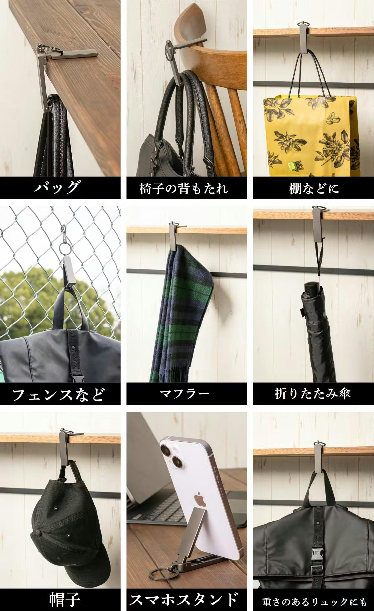 また、バッグやリュックを掛けるだけでなく、帽子やストールなどの小物をスマートに掛けられる点も特長です。カフェやレストランで一時的に置き場所に困りがちなアイテムを、床に置くことなく管理できます。小物類をまとめて掛けておくことで、紛失防止にもつながり、外出先での安心感が高まります。使い方次第で、身の回りの整理整頓にも役立ちます。