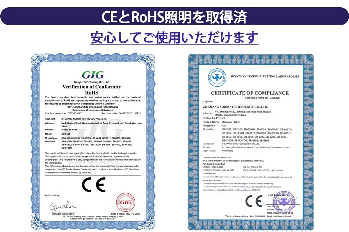 人体に危険が及ばないことを証明するCEマーク及び、有害物質を使用していないことを証明するRoHSを認証取得しておりますので安心してお使いいただけます。