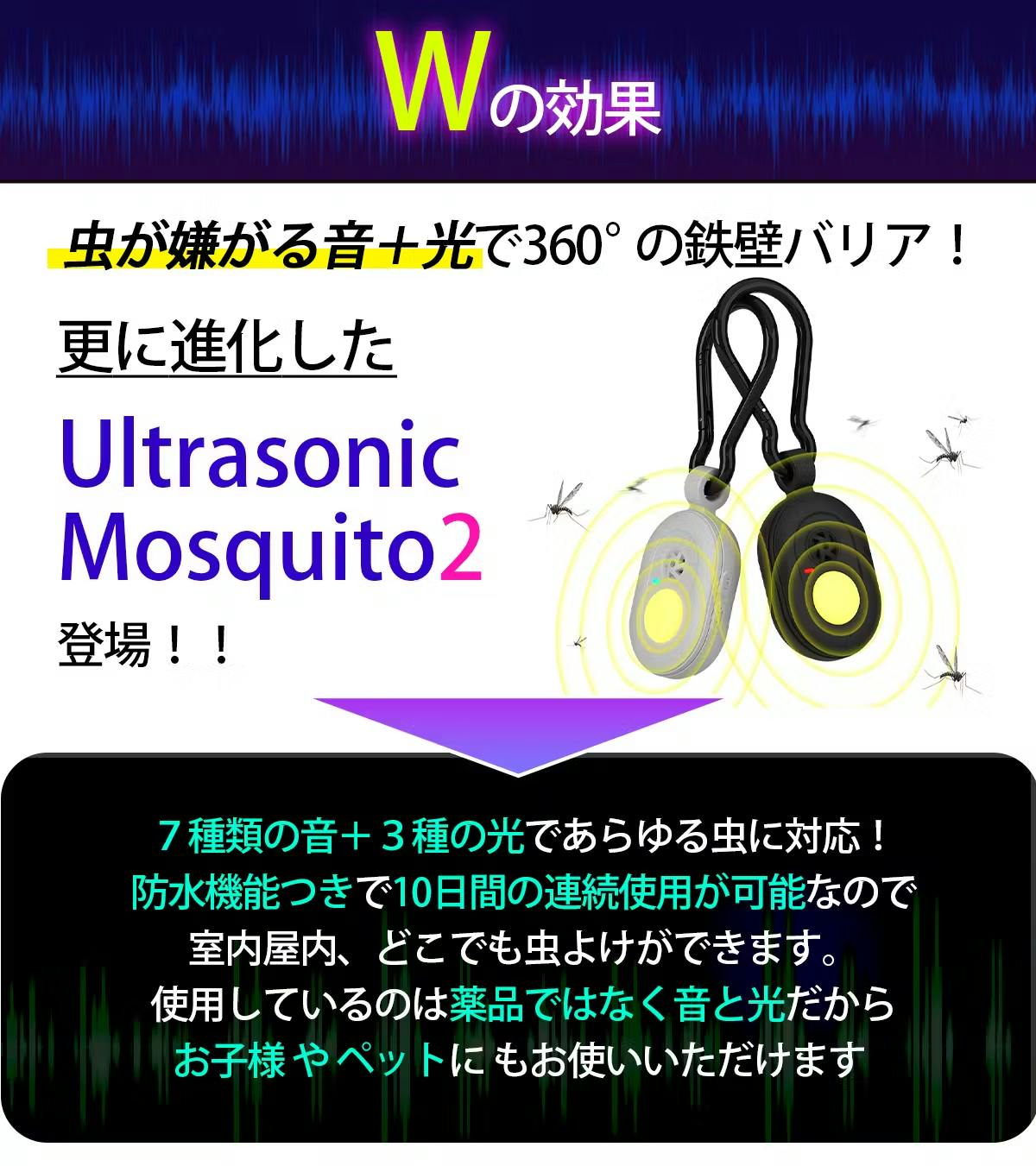 Ultrasonic Mosquito2は蚊の嫌がる音波を出し、効果的な蚊よけを行います。