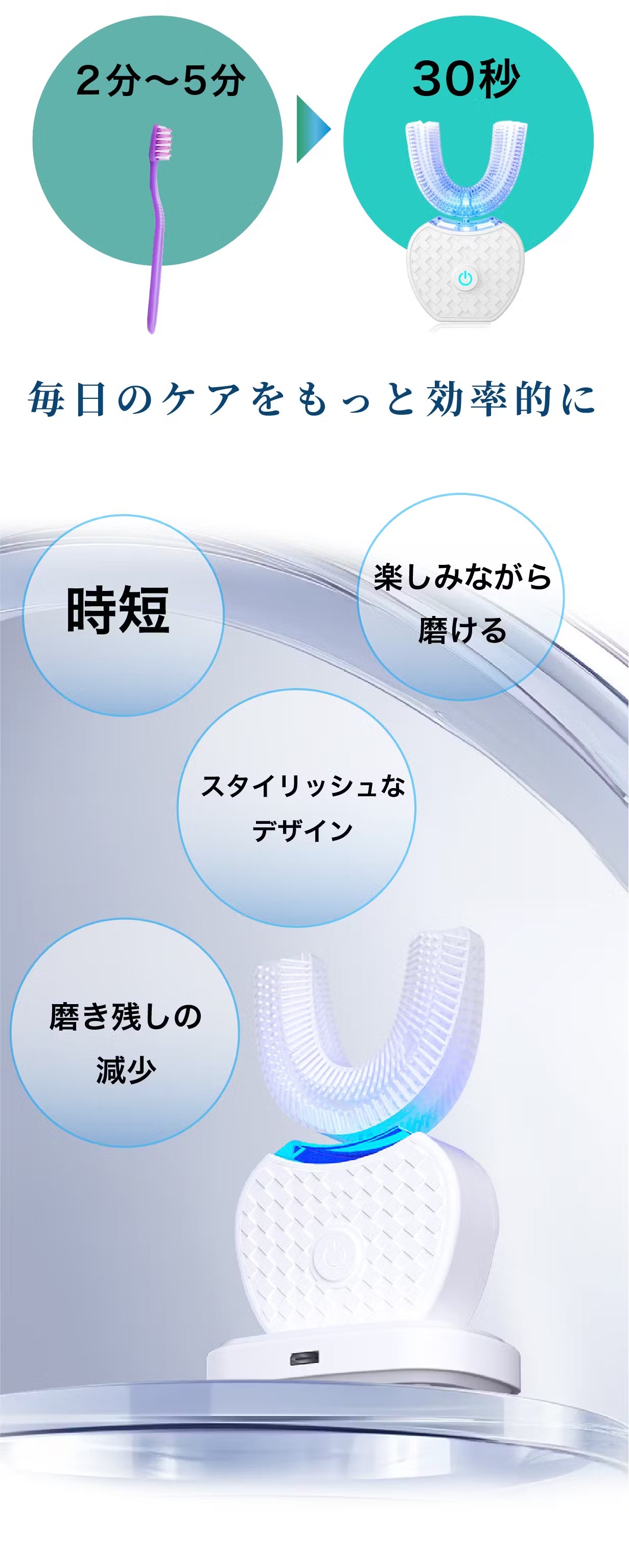 「U字型電動歯ブラシ」は、毎日の歯磨きを正しく効率的に続けられるよう開発されました。わずか30秒で歯磨きが完了し、虫歯や歯周病の予防をサポートするため、忙しい現代人にも手軽で続けやすいオーラルケア習慣を提供できるツールだと考えております