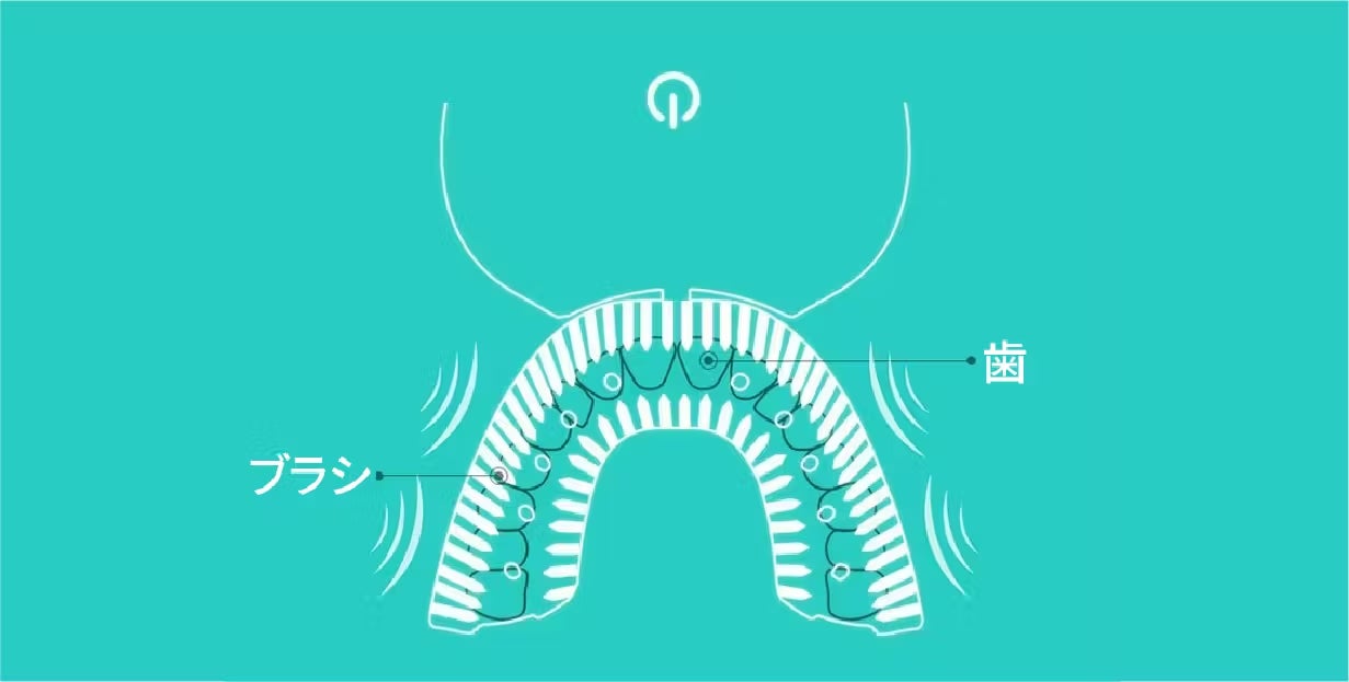U字型ブラシが歯列全体を包み込み、超音波振動が歯垢や着色汚れを浮かせます。