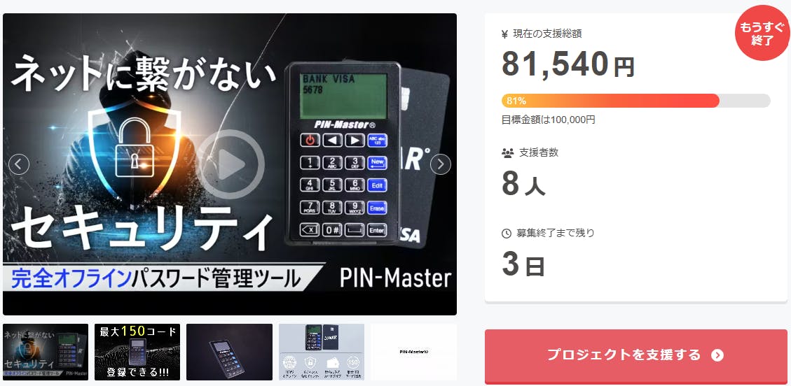 プロジェクト終了後、「完全オフラインでアナログと同等のセキュリティ!超薄型パスワード管理ツール」をCampfire特別価格で入手することはできなくなりますので、ご支援がまだの方、追加支援をご検討の方はお急ぎくださいますようお願い申し上げます。