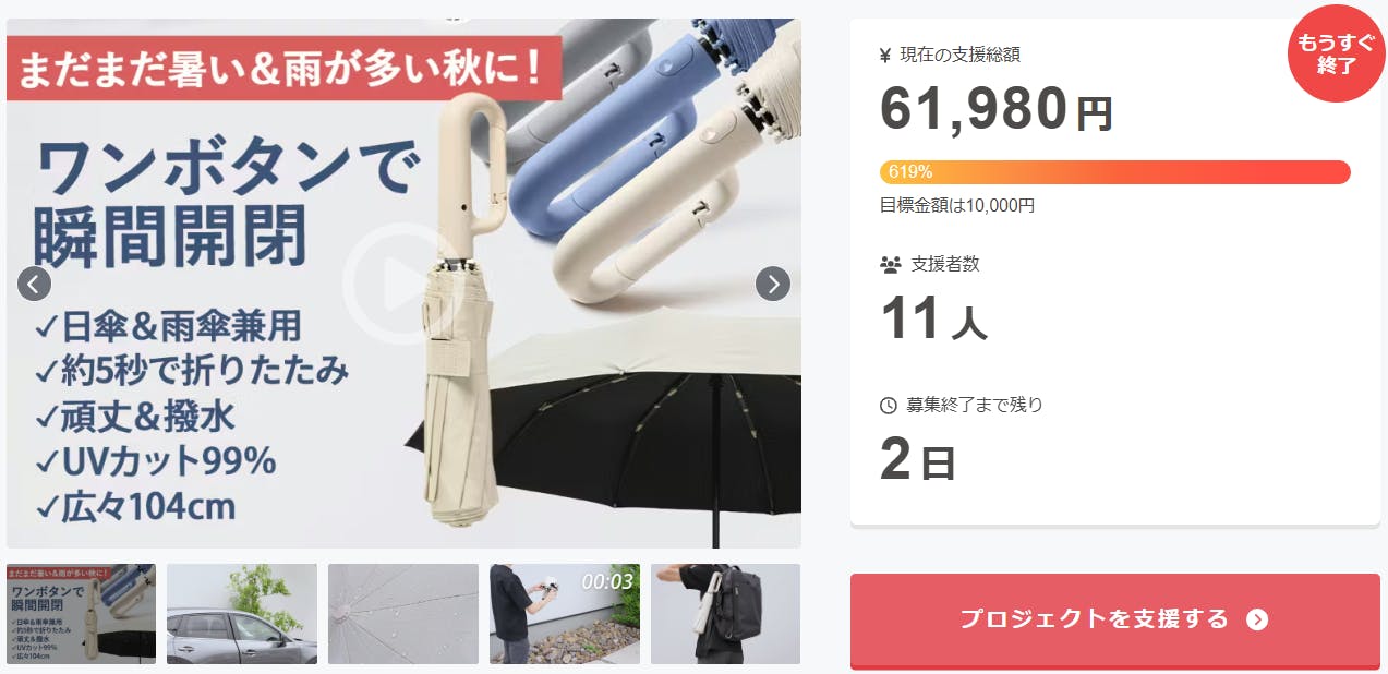 プロジェクト終了後、「【99%遮光!超撥水!折り畳み約5秒!】ワンタッチ楽々開閉の晴雨兼用折りたたみ傘」をCampfire特別価格で入手することはできなくなりますので、ご支援がまだの方、追加支援をご検討の方はお急ぎくださいますようお願い申し上げます。