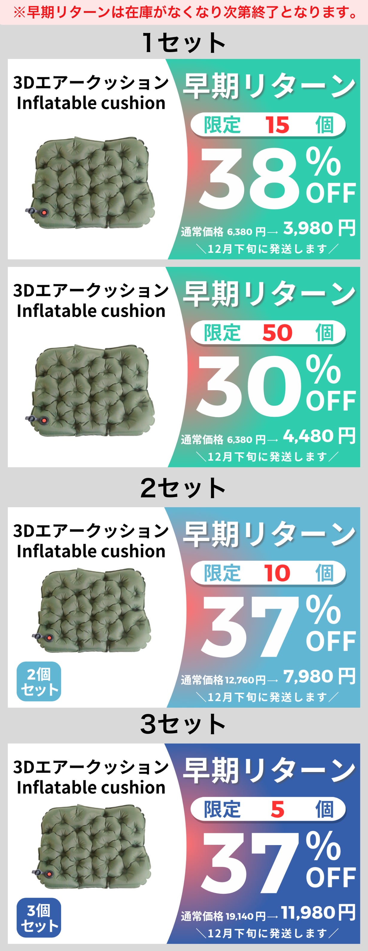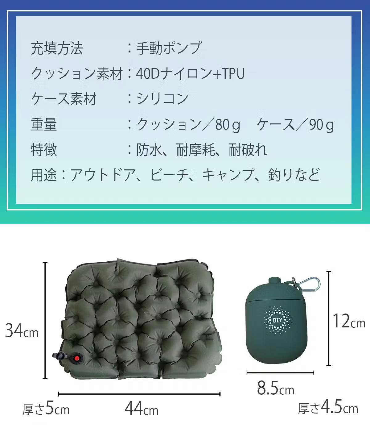 屋内・屋外問わずにとこでも座れるエアクッション。ケースがポンプになるので膨らませるのもたたむのも簡単です。口で膨らませる必要がないので衛生的、かつクッション生地じたいも耐摩耗・耐破れ・防水機能が備わっており、ゴツゴツした場所の多いアウトドアでも長くお使いいただけます。
