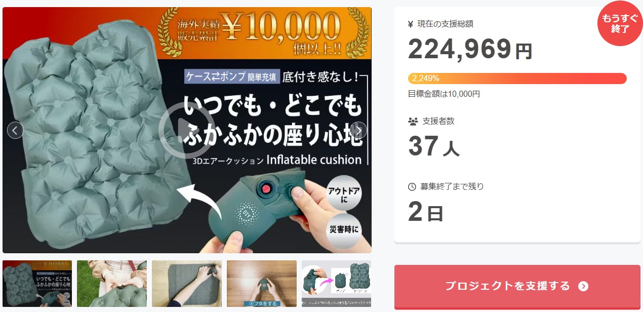 プロジェクト終了後、「【累計出荷数1万個】どこでも簡単に膨らませられる厚さ5cmの3Dエア―クッション」をCampfire特別価格で入手することはできなくなりますので、ご支援がまだの方、追加支援をご検討の方はお急ぎくださいますようお願い申し上げます。