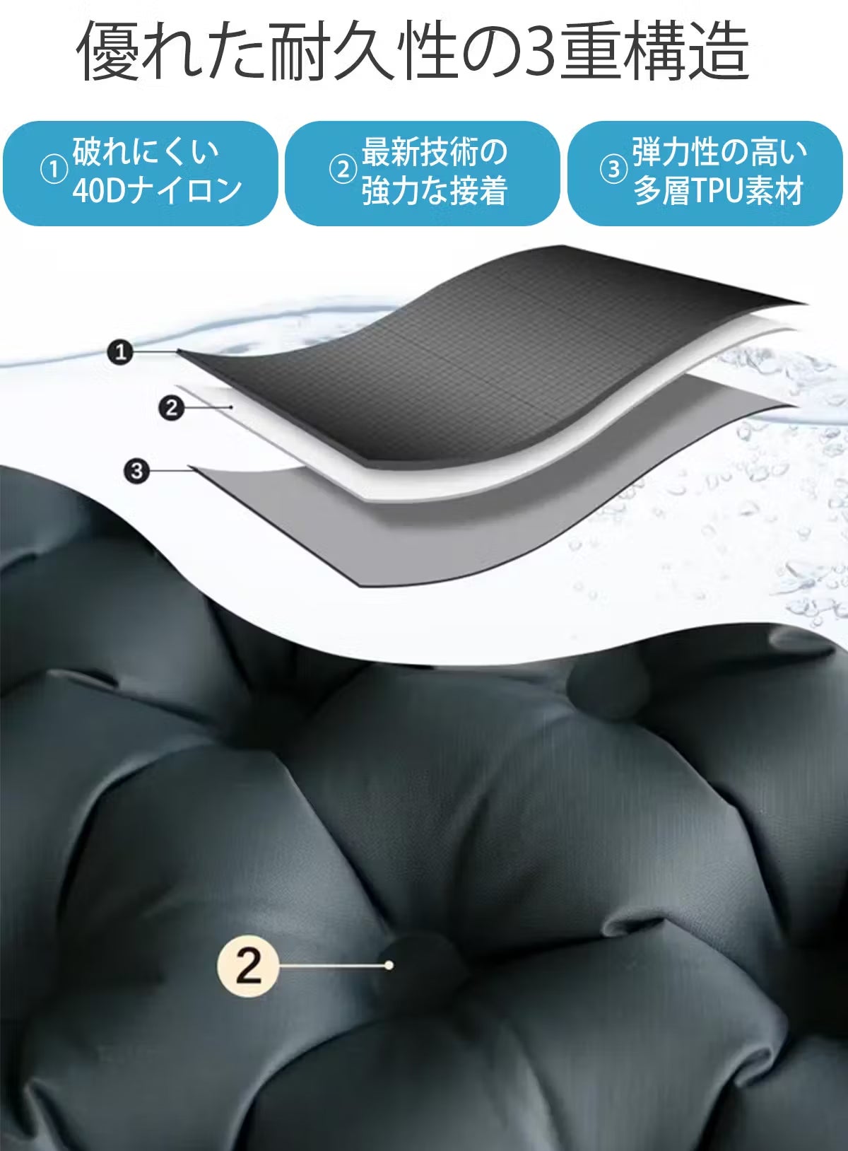 TPU素材は多層構造になっているので更に強度が高まり、破れや摩耗に対する耐性が向上しています。まさにアウトドアでの使用にうってつけ!