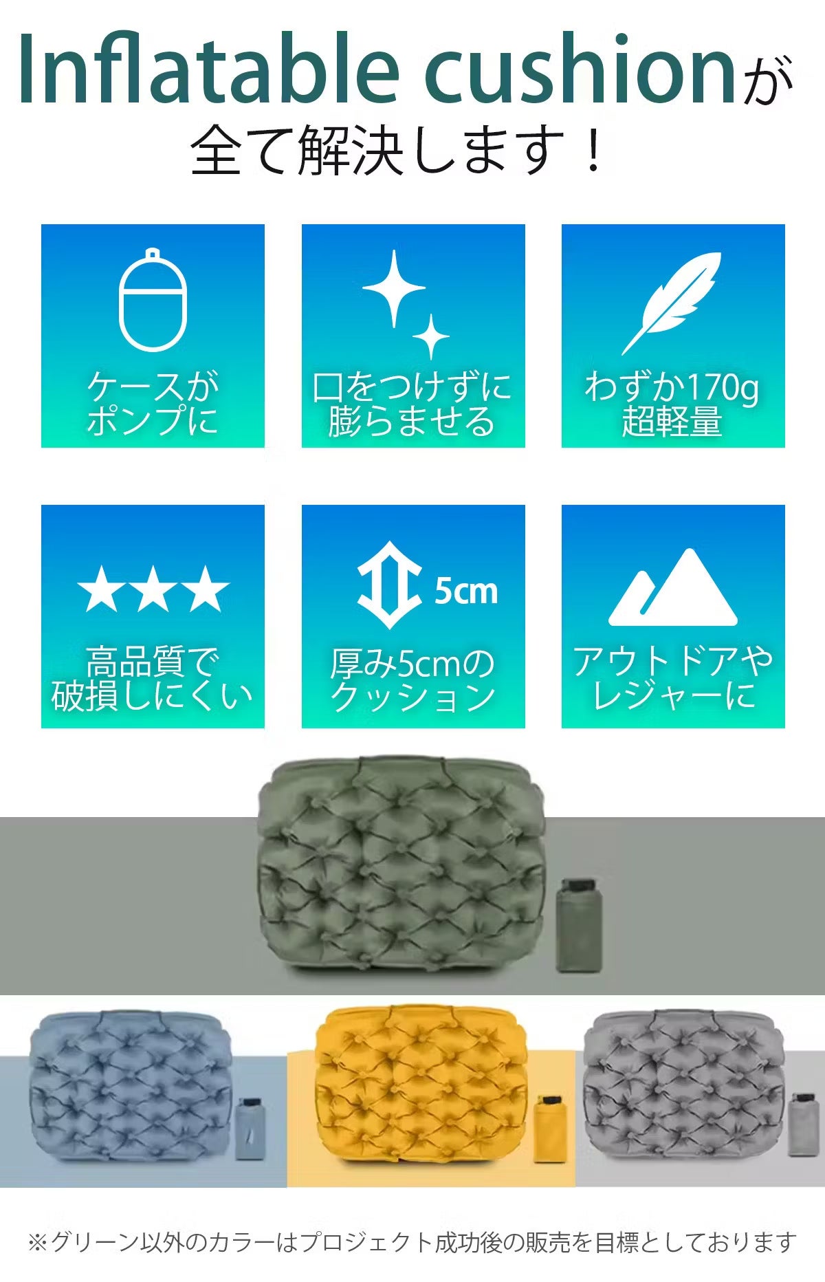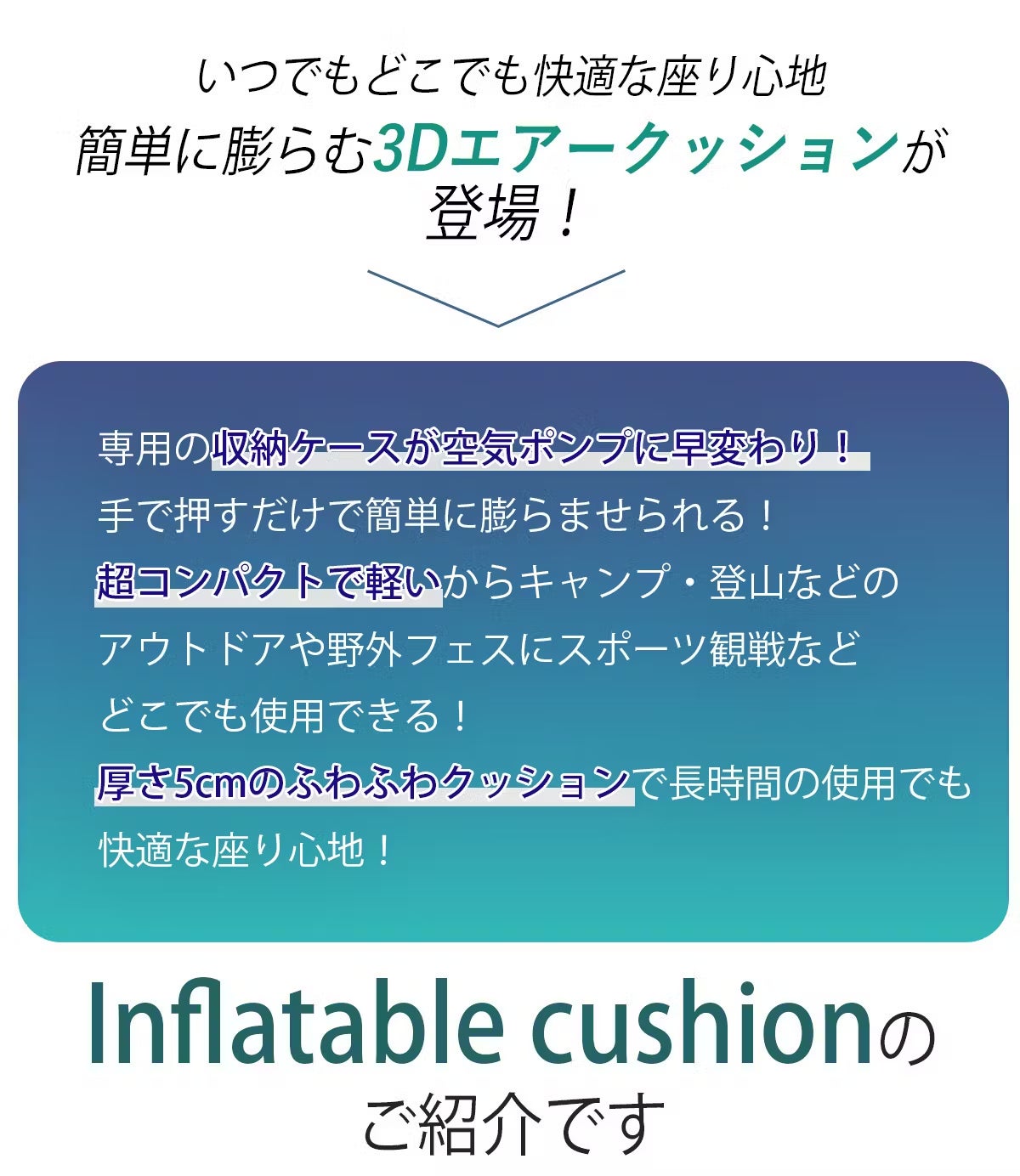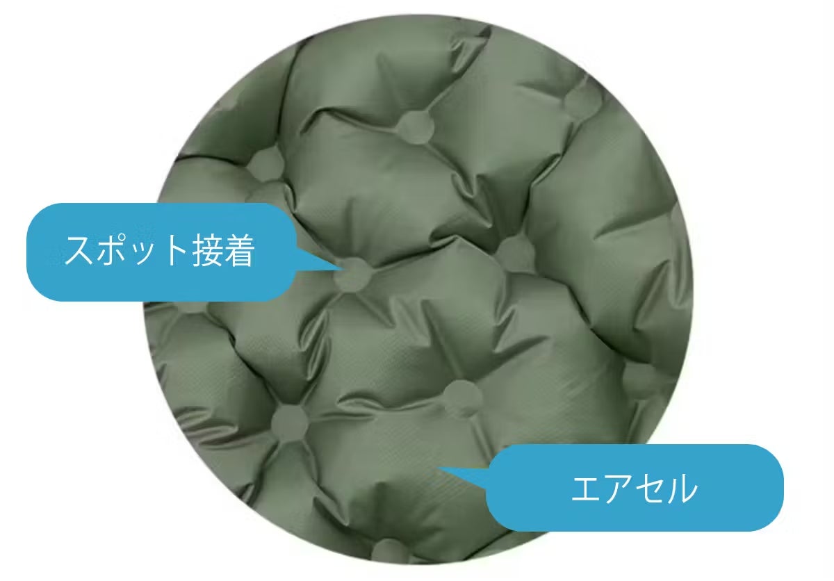 屋内・屋外問わずにとこでも座れるエアクッション。ケースがポンプになるので膨らませるのもたたむのも簡単です。口で膨らませる必要がないので衛生的、かつクッション生地じたいも耐摩耗・耐破れ・防水機能が備わっており、ゴツゴツした場所の多いアウトドアでも長くお使いいただけます。
