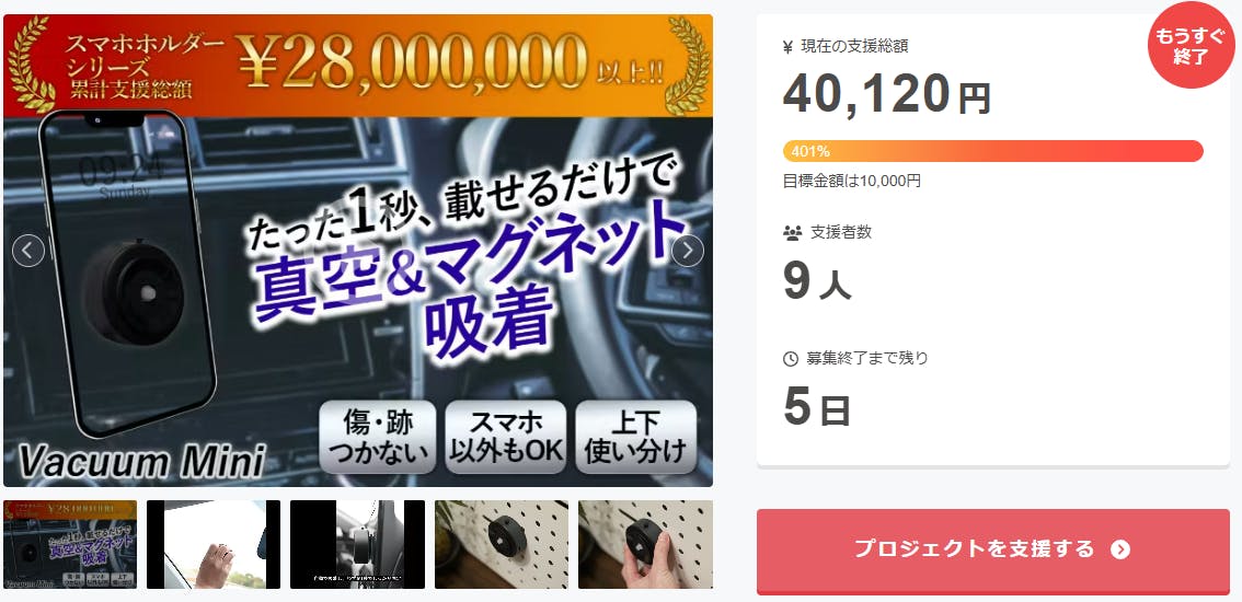 プロジェクト終了後、「車内やキッチン、どんな場所でもスマホが固定できる!真空&磁気吸着式スマホホルダー」をCampfire特別価格で入手することはできなくなりますので、ご支援がまだの方、追加支援をご検討の方はお急ぎくださいますようお願い申し上げます。