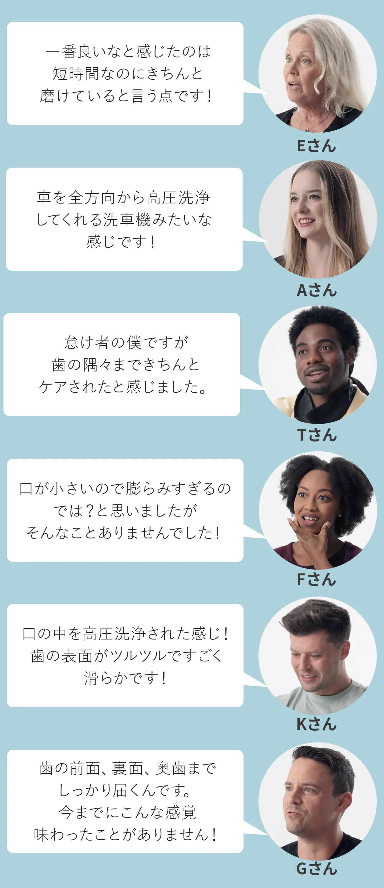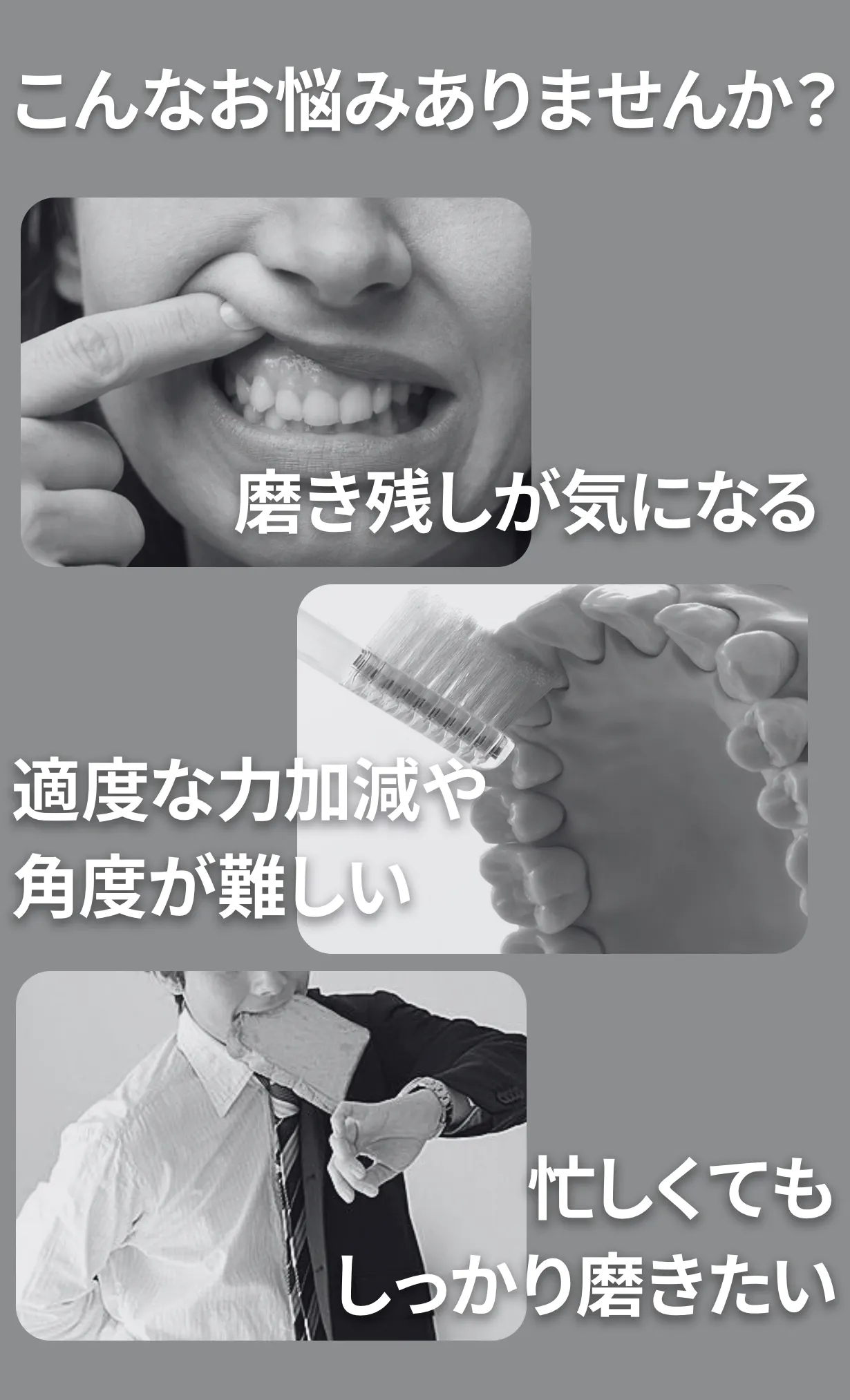 さまざまな速度の振動を使って、歯の表面を磨きます。通常の歯ブラシや電動歯ブラシとは違い、「AutoDent」が勝手に磨いてくれます。