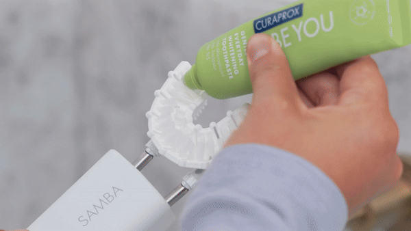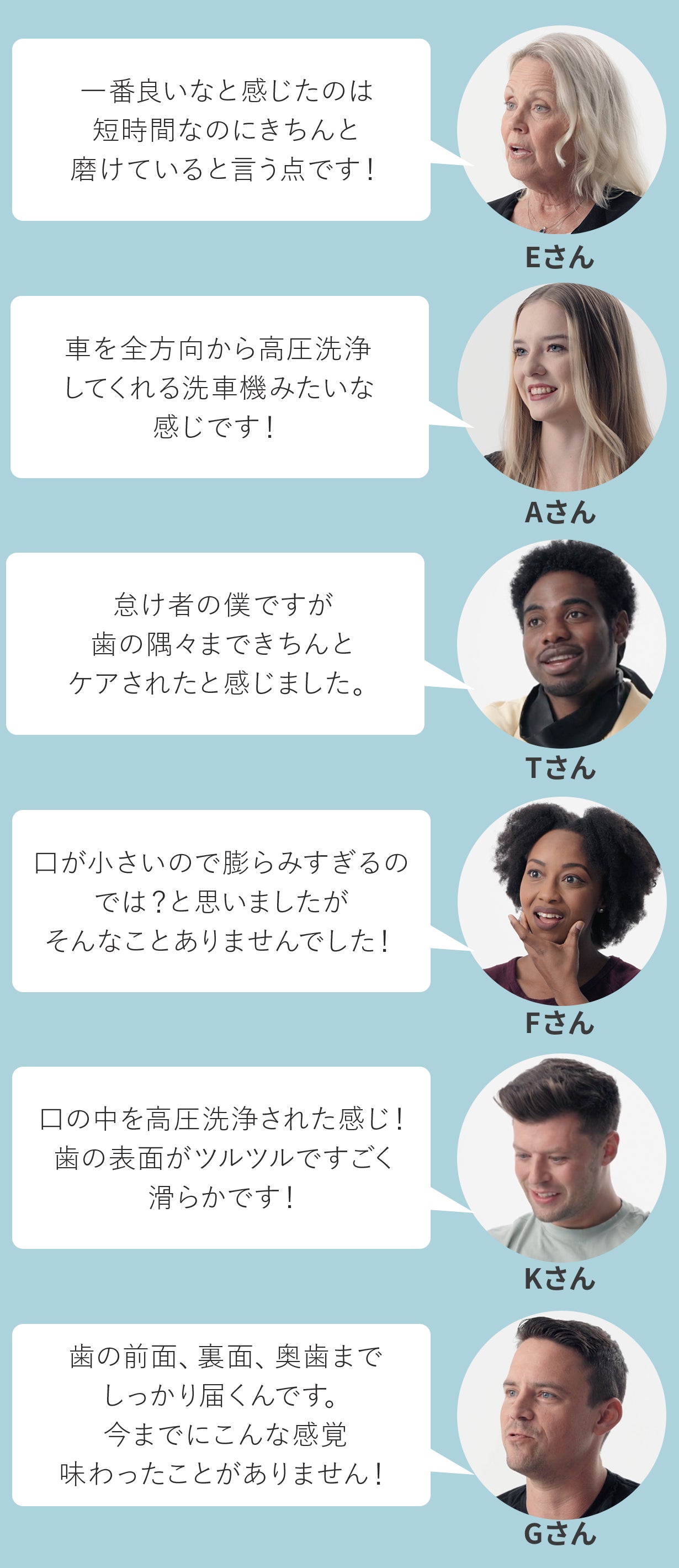 A:ブラシヘッドを流水の下に置き、指で残ったデブリや歯磨き粉の残りを取り除いてください。現在の歯ブラシと同様に行ってください。