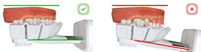 A:はい。ハンドルを左右に動かして調整してください。例えば、ブラシヘッドが口の右側に向かって動いているときは、ハンドルを少し右に動かします。この方法で、「AutoDent」は親知らずも磨けます。