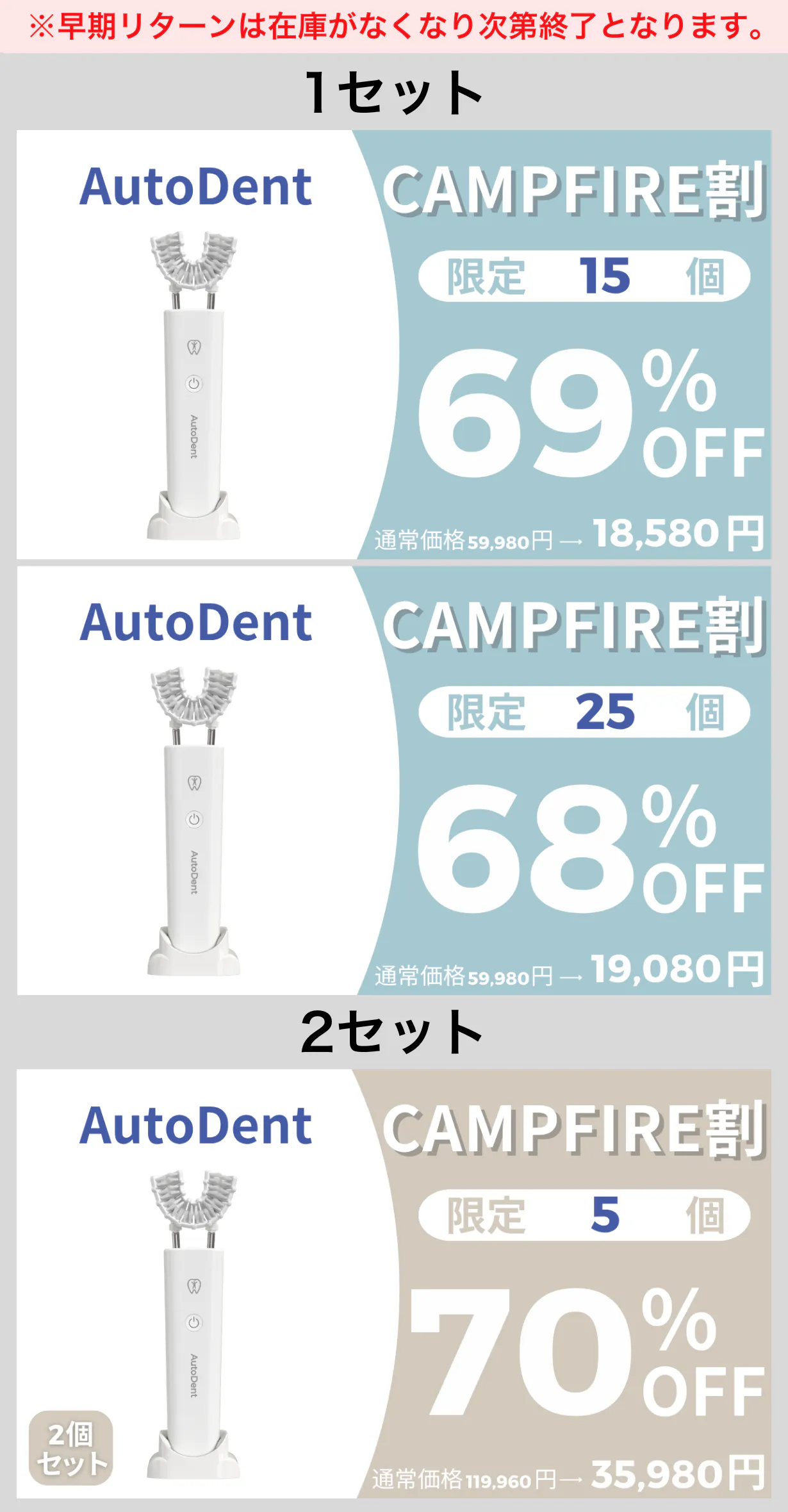 2026/03/18 08:00みなさん、こんにちは。BRIGHT DIYです。本日は皆さまに新しいプロジェクトを紹介させて頂きます。最大70%OFF!!!50,000回/分の音波振動で、外出先でも口の中スッキリつるつるで息もスッキリ綺麗!自動乾燥&UVクリーナーで常に清潔な歯ブラシ&歯間ブラシセット。ケースに収納するだけで衛生的に保ち、自動で充電までしてくれて便利。プロジェクト概要キャンペーン期間 2026年3月18日~2026年4月30日プラットフォーム CAMPFIREキャンペーンURL https://camp-fire.jp/projects/923656/view※プロジェクト公開後から閲覧可能になります。2026年3月18日の8時からプロジェクト公開となります。 数に限りがございますので、早い者勝ちです!!!先着20名様のみ70%の早割を適用させて頂きます!※早期リターンは在庫がなくなり次第終了となります。 もっと見る