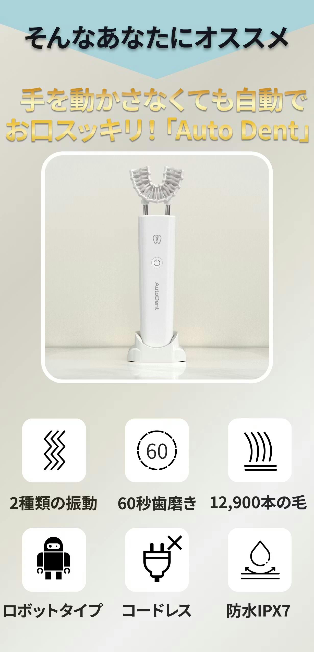 歯磨きは毎日の口腔ケアで最も重要な習慣の一つですが、特にお子様やお年寄り、または関節炎などで手を動かしにくい方にとっては、しっかり磨くのが難しいこともあります。そんな方々におすすめなのが、手の負担を軽減しながら効率的に磨ける電動歯ブラシ「AutoDent」です。誰でも簡単に使える設計で、毎日の歯磨きをより確実で安心できるものにしてくれます。