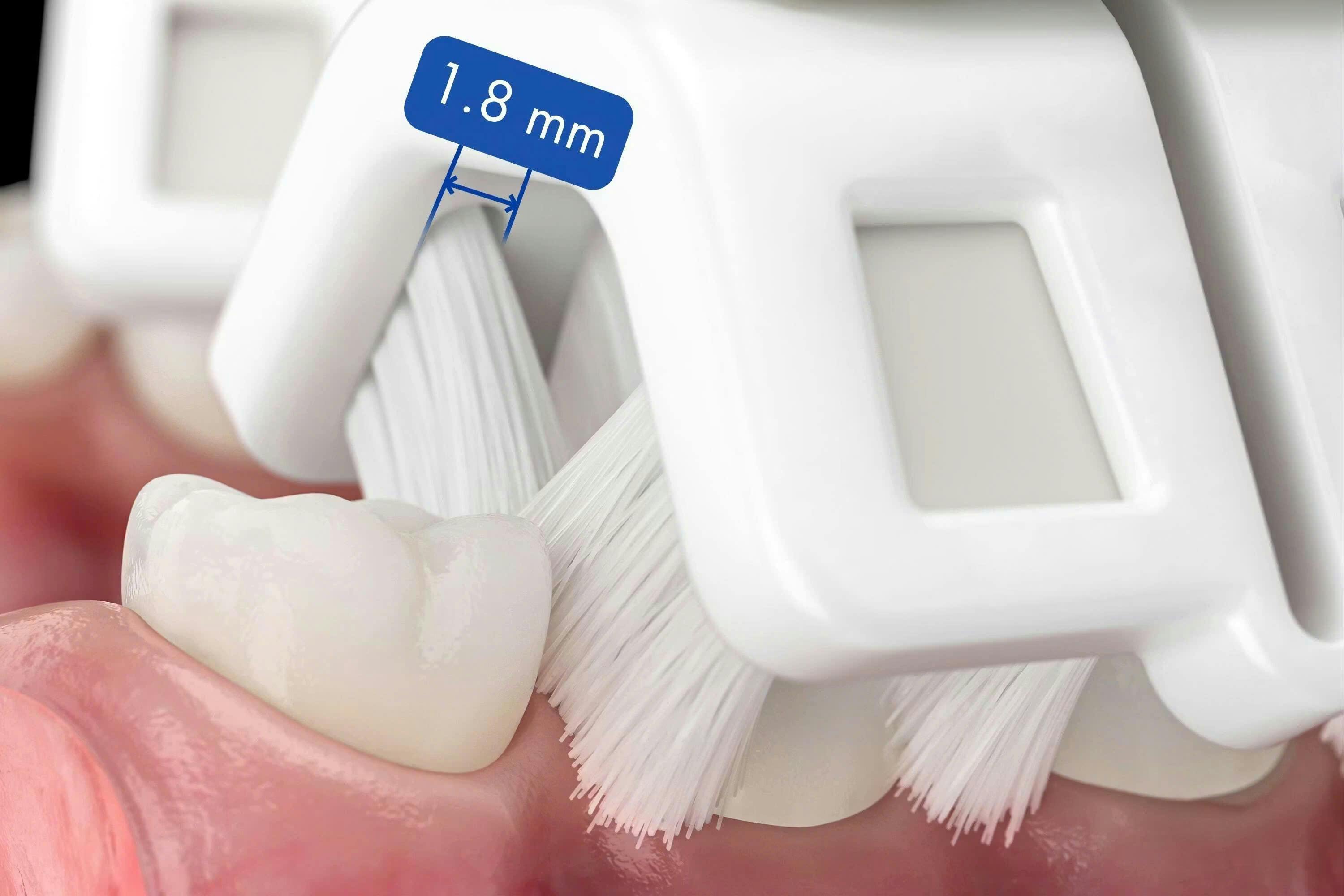 AutoDentは、前歯から奥歯までの形状に合わせた清掃ができるように設計されています。前歯には歯茎に届く長い毛を、大臼歯には歯全体を包み込む短い毛を使用しているため、どんな歯の形状にも対応し、磨き残しを防ぎます。
