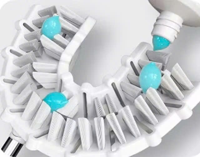 AutoDentの大きな特徴は、前歯から奥歯までのすべての歯に対応したブラシ設計です。前歯には歯茎まで届く長い毛が配置され、大臼歯には歯全体を包み込む短い毛が採用されています。さらにブラシヘッドは6度の角度で動くため、口内にぴったりフィットし、子どもから大人まで快適に使用できます。これにより、磨き残しを防ぎ、歯の隅々まで清掃することが可能です。