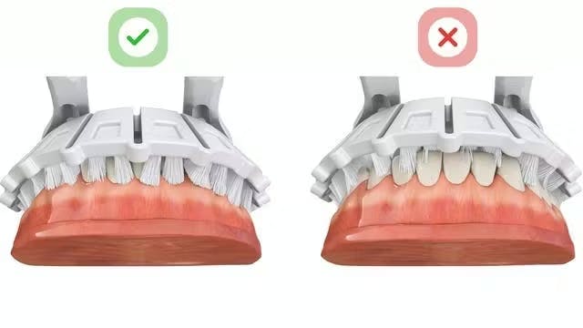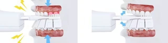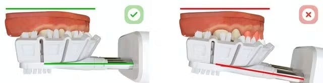 まず最も重要なのは「噛まないこと」です。手動の歯ブラシのように力を入れて磨く必要はなく、ブラシヘッドを反対側の顎で軽く支えるだけで十分です。振動技術を駆使したAutoDentは自動で動くため、噛んだり押したりする必要はありません。力を入れすぎるとブラシの動きが不安定になり、最適なブラッシングができなくなる可能性があります。また、軽く支えるだけで歯垢を効率よく除去できるので、歯茎への負担も最小限に抑えられます。